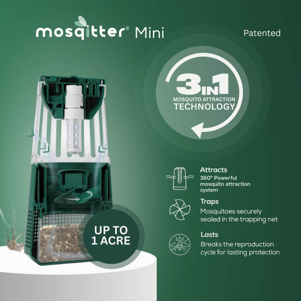 Sprays, foggers, or toxic chemical repellents are the common go-to solutions to kill mosquitoes. They are effective but cause more harm than good to the respiratory system, both to humans and animals. There’s a far better and safer option called Mosqitter Mini. It’s a chemical-free alternative to mosquito control founded by Mosqitter, a female-founded climate-tech company.