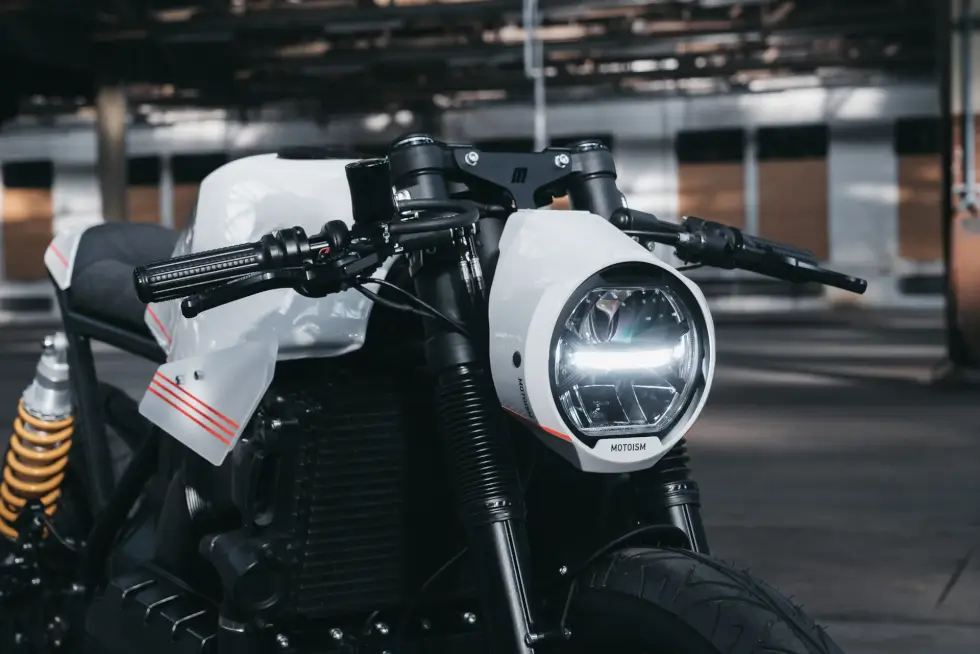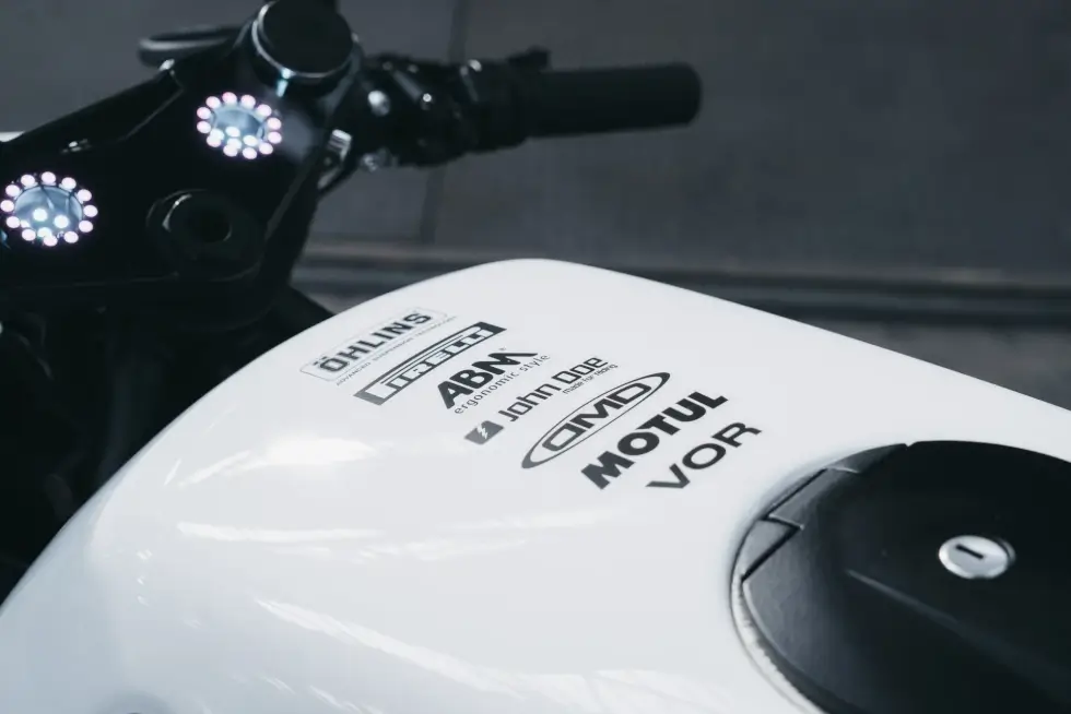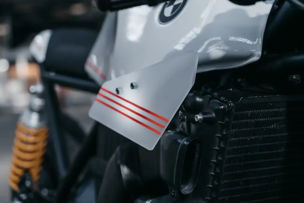 We have black and white BMW roundels on the tank, a custom LED taillight, LEDs on the top triple, a radiator cover delete, laser-cut acrylic glass winglets, and more. Elsewhere, The Ultimate K features Motogadget grips, a custom Öhlins mono-shock, and a lowered front suspension.