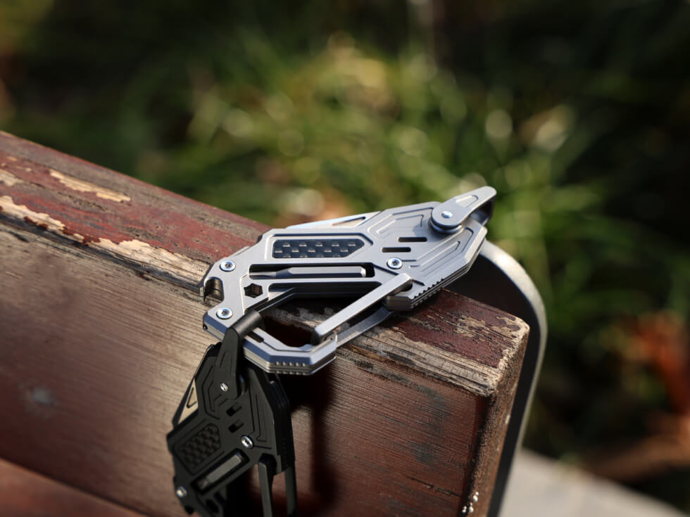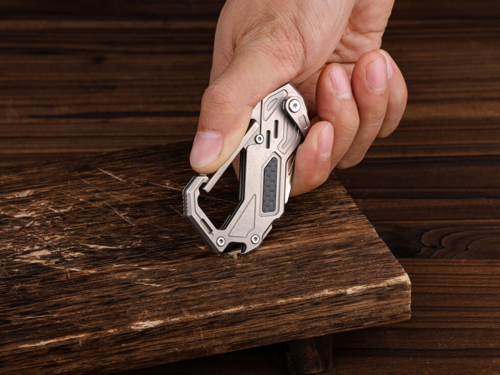It boasts a shell crafted from lightweight, corrosion-resistant, and remarkably strong Grade 5 titanium. The body features carbon fiber inlays for added grip, durability, rigidity, and aesthetic appeal. These combined materials create a tool that offers both lightweight strength and build that will last for many years.