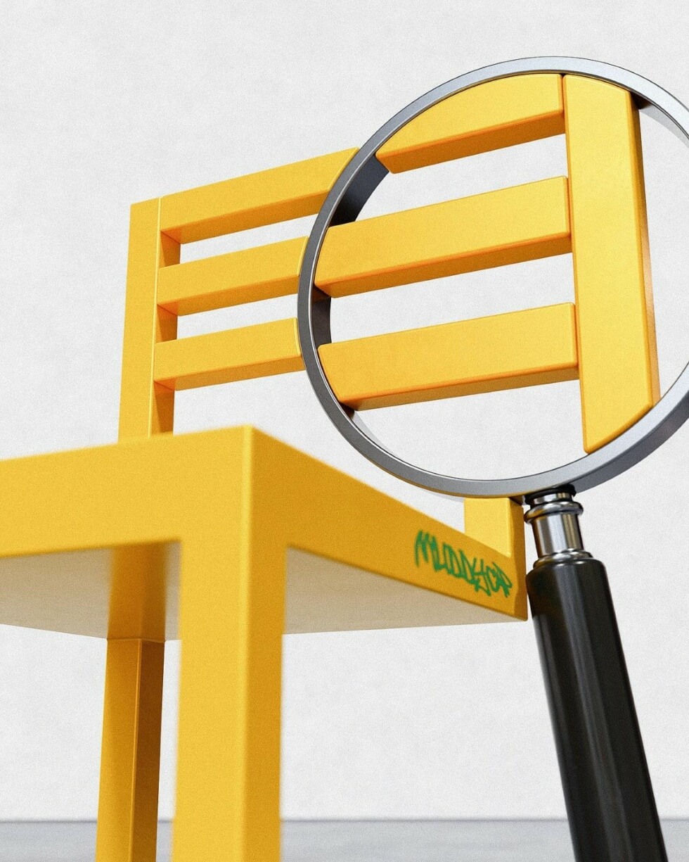 The Zoom Chair lives up to the label thanks to a simple yet bold tweak. Although 75% of its construction is presented as a traditional wooden seat, the remaining 25% takes the form of a magnifying glass. Its handle replaces one of the legs, while the frame is where the illusion is.