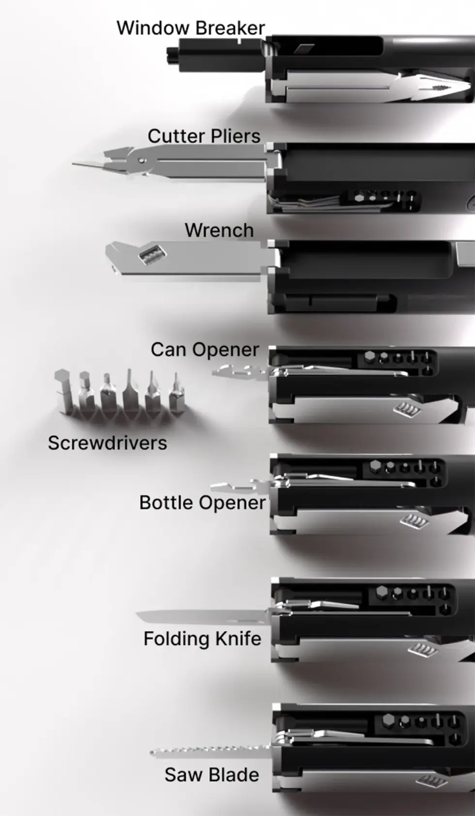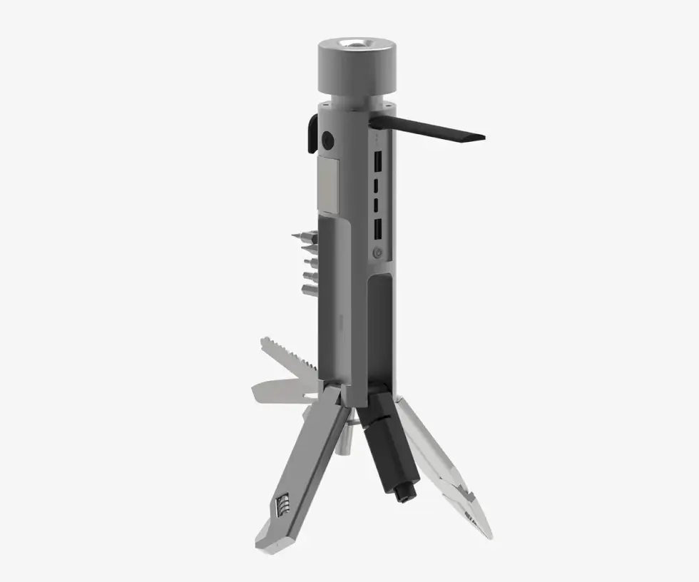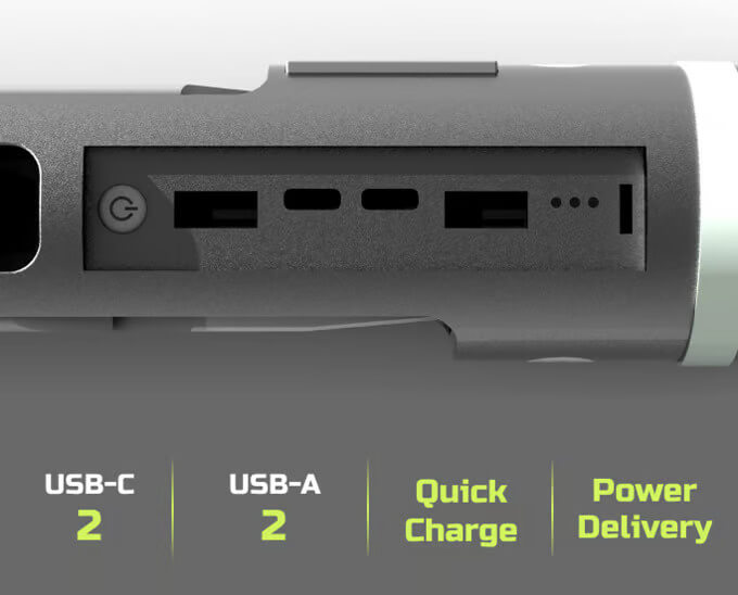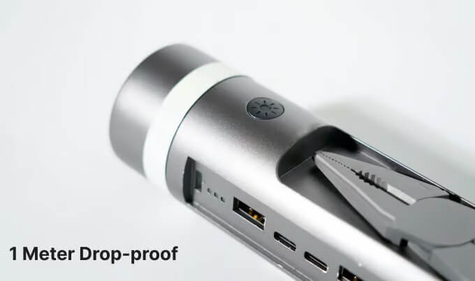 The MutiFlex runs on a rechargeable 3500mAh 18650 lithium-ion battery that doubles as a power bank using its built-in 2 USB-C and 2 USB-A ports. The ports have power indicator lights and a power bank switch protected with an IP66-rated waterproof silicone cover. Other utility tools include a window breaker, wire cutter pliers, an adjustable wrench, a can and bottle opener, a hex and flat screwdriver, a saw blade, a folding knife, and a bit holder.