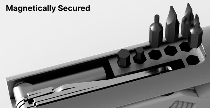 This EDC measures 8.7″ long and 2″ wide and features an innovative folding design that magnetically secures the other tools. As a flashlight, it offers three adjustable light settings with 1000 lumens of max brightness at a max beam distance of 300 meters, followed by 672 lumens, and 17.5 lumens.