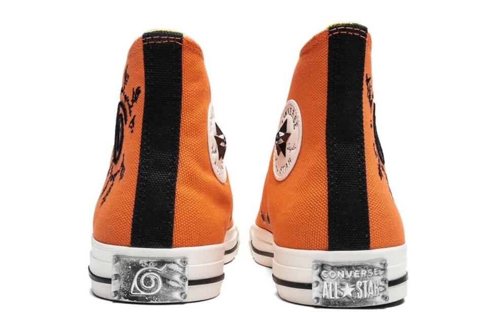 First up from the Naruto x Converse Chuck Taylor Pack is the (Konohagakure) Hidden Leaf Village’s 7th Hokage’s pair of shoes. As expected, the canvas upper is completely orange with color-matching stitching. To give these a little more distinction, we have embroidery of the Eight Trigrams Seal on the lateral sections near the heel.