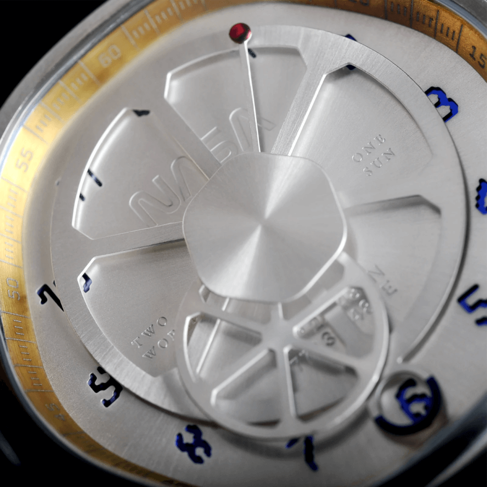 Moving on to the sunburst dial, the outer rim is in gold with the indices in black. The hour markers, on the other hand, appear to be cutouts with a metallic blue interior. NASA X ANICORN adds engravings of the coordinates of the Jezero Crater, the space agency’s logo, and the text Two Worlds, One Sun.