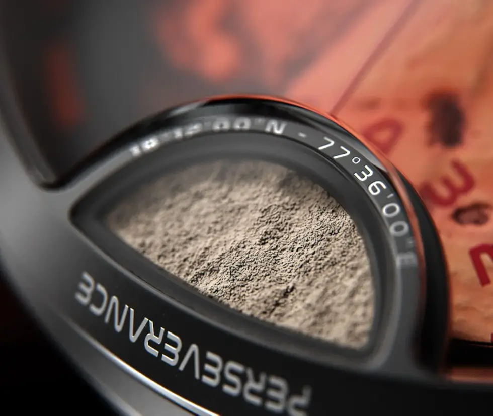 The piece of space rock was first discovered in 2021 in northwest Africa. Supplying the material is MSG meteorites. Units with the dust samples will ship with a certificate to attest to their authenticity. Those who just prefer the aesthetics of the timepiece can choose to leave it empty but with an engraving of NASA’s “meatball” logo instead.
