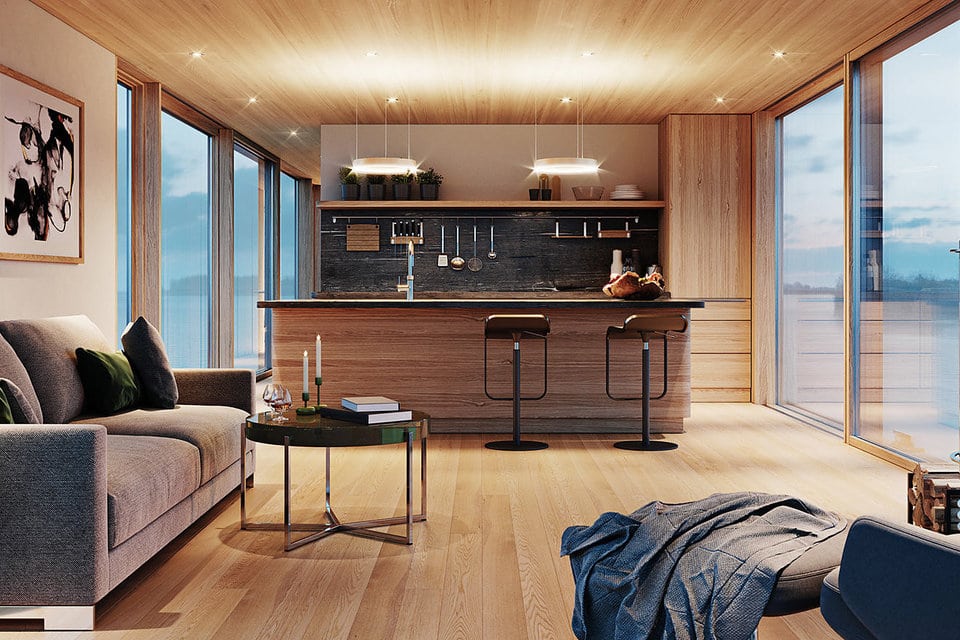 All jokes aside, this thing’s a beaut. It doesn’t take a genius to figure that out — one look at its warm wood-clad and modern fixtures will make you want to escape the tangled city life and hop in at once. Wide windows abound in this wee Scandinavian gem, offering you spectacular views of the surrounding water.