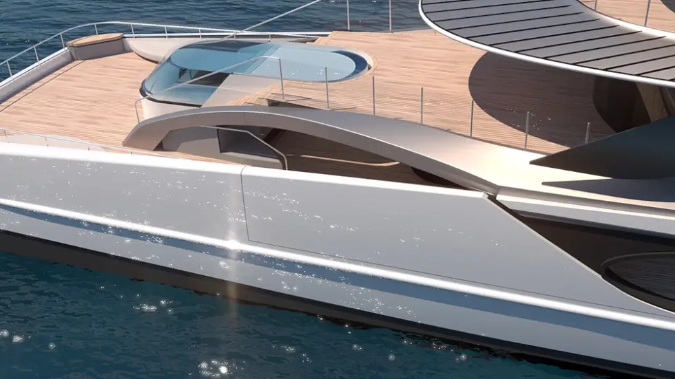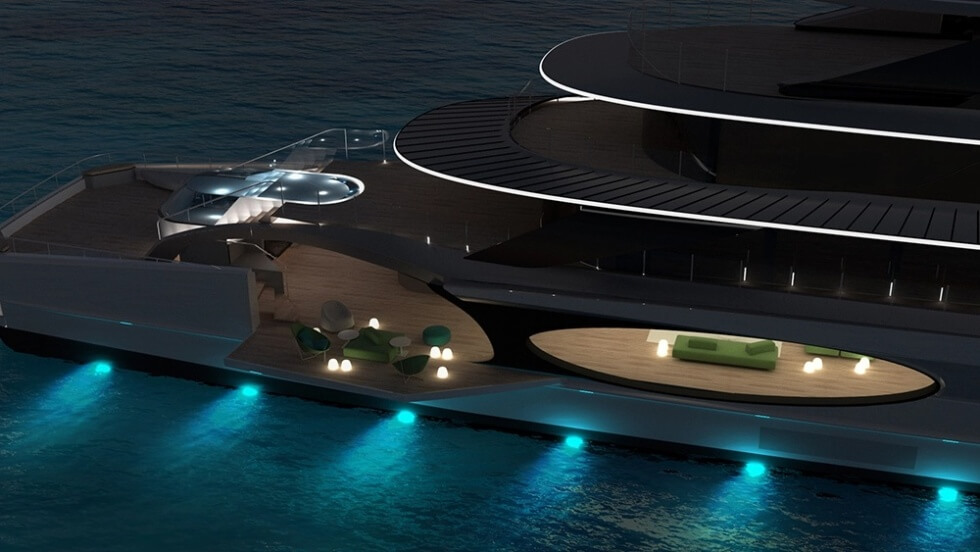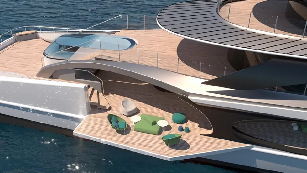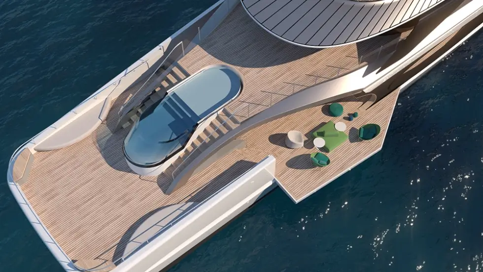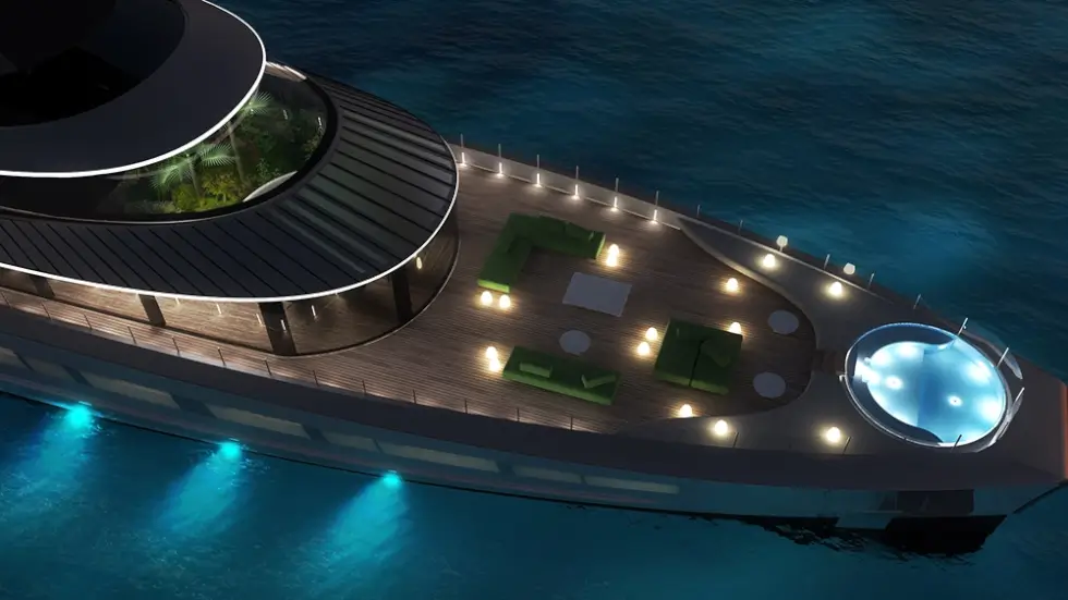 “The project finds inspiration in the world of jewelry, for iconic and highly buildable shapes,” notes the designer. “The architectural concept of a superstructure made up of separate elements opens up many possibilities for interpretation and customization.” On the main deck is a semi-enclosed saloon where guests can socialize.