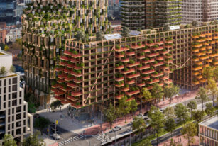 The Timber House will feature a crisscrossed of narrow beams for its faca, patios for plants, and a rooftop urban farm.