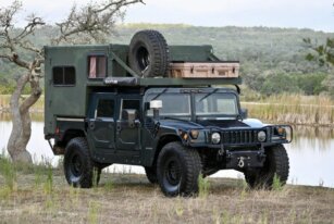 The 1994 AM General Hummer H1 camper conversion rides on a set of 17” black alloy wheels shod in 40” x 13.50” Pro Comp Xtreme MT2 tires.