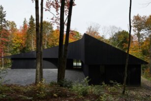 Within the dark façade of the MEV Cabin is an interior replete with reflective surfaces, vibrant shades, and intricate patterns.