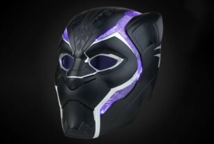 The Marvel Legends Series Black Panther Electronic Role Play Helmet features padding inside and is adjustable to fit most head sizes.