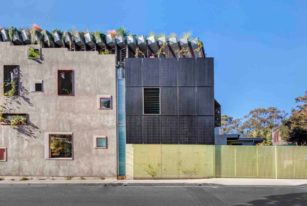 The Welcome to the Jungle House is a sustainable residential property of modern and contemporary elegance that boasts a rooftop garden, open-air pond, and an impressive black photovoltaic panel array for solar energy.