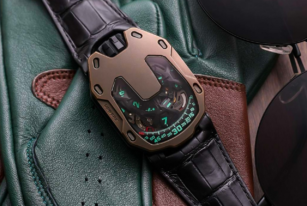 The Urwerk X The Hour Glass UR-105 is a watch that tells time using a unique wandering hours mechanism and shows its age via the patina on its bronze case.