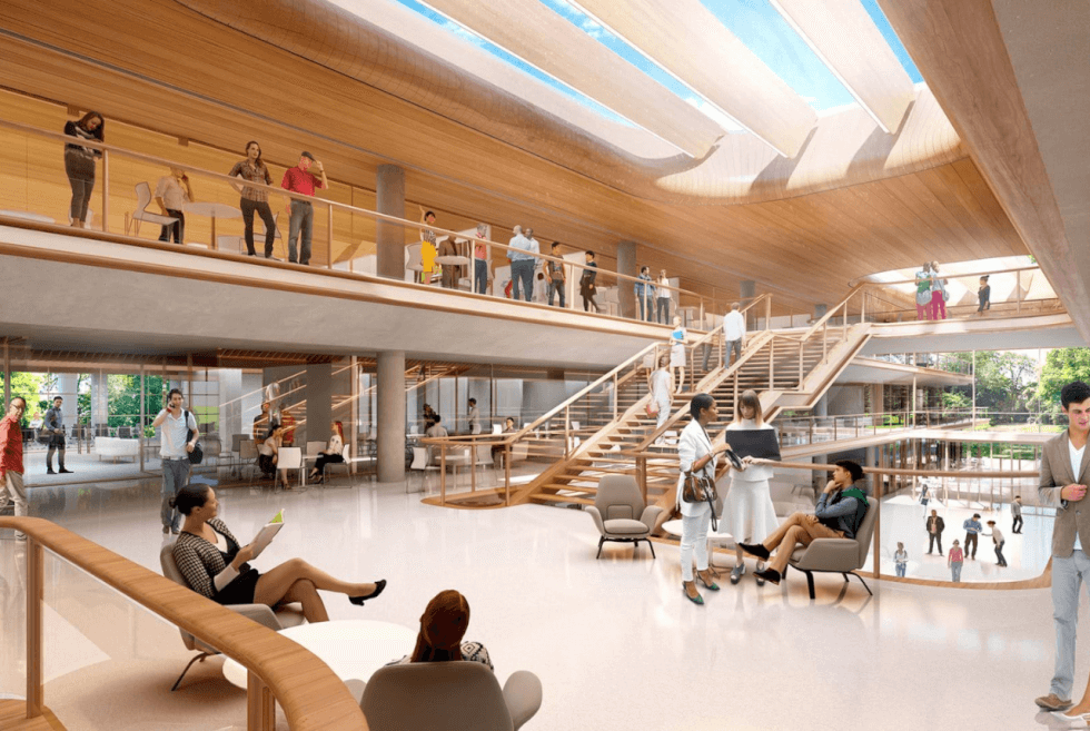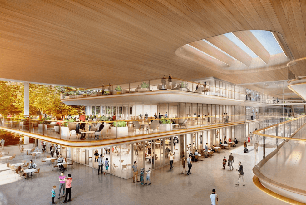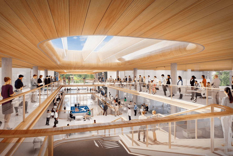 Another striking feature is the oversized overhand of the roof that extends to cover a section of the pond. With floor-to-ceiling glass windows wrapping around and an atrium, natural light floods the interior. According to Foster + Partners, they want to imbue the PGA TOUR building with “a sense of openness and transparency.”