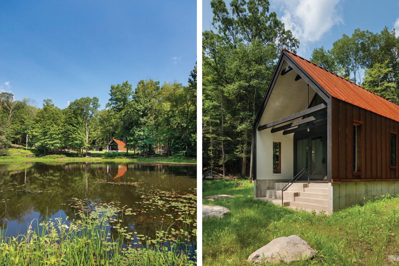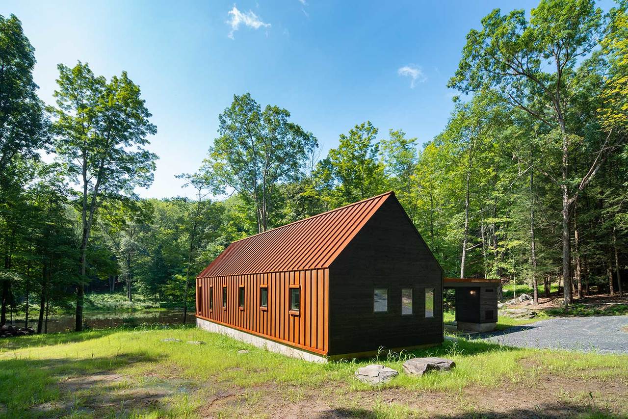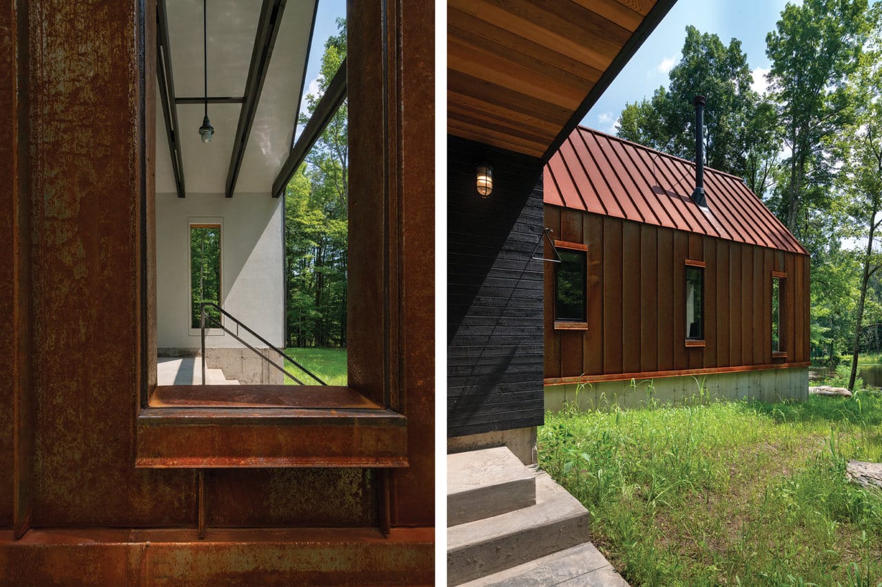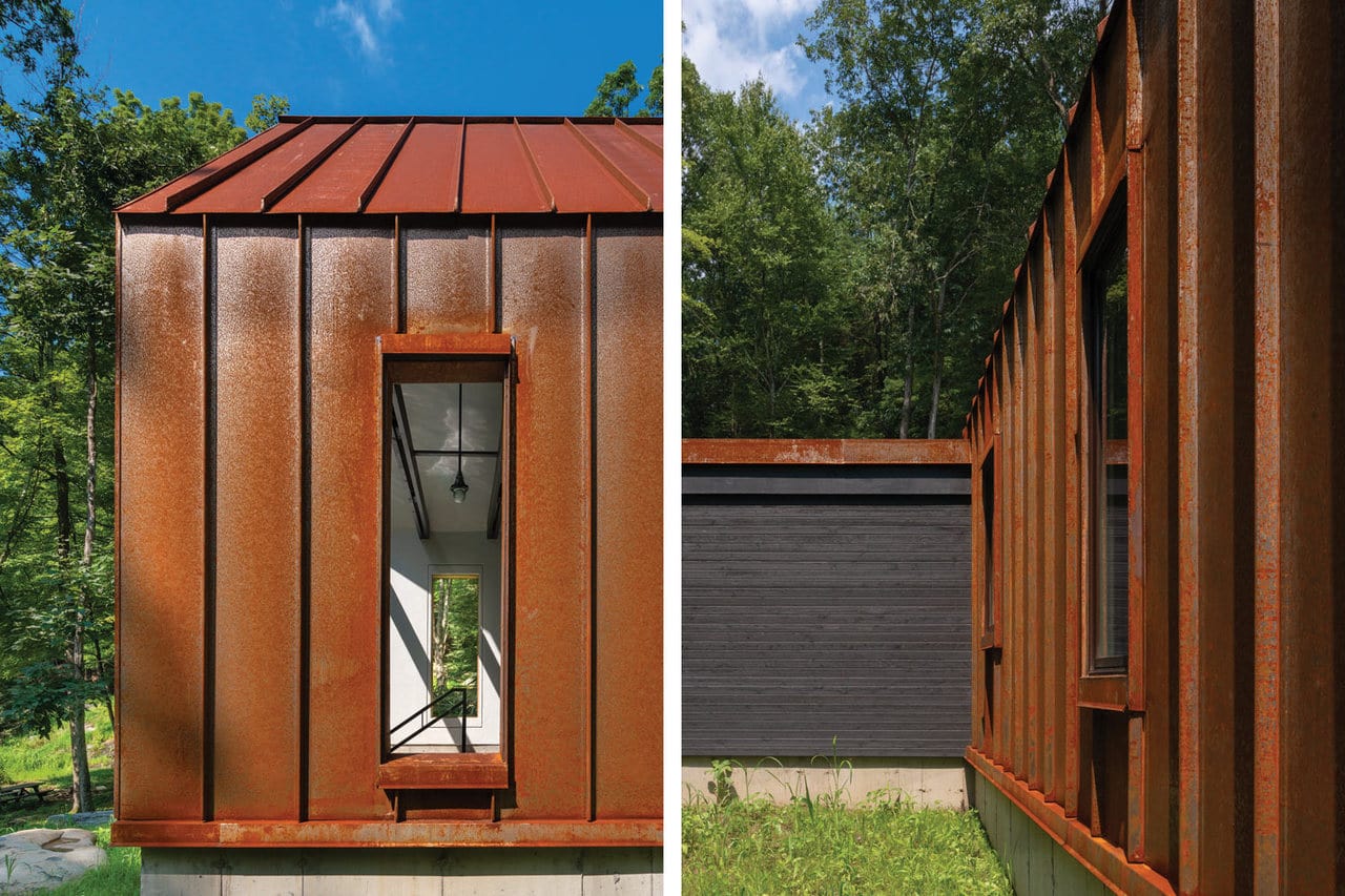 The palette consists of rusted corten standing seam panels and blackened cedar. A combination like that seems like it won’t work, but it does. And you have the surrounding nature to thank for that synergy.
