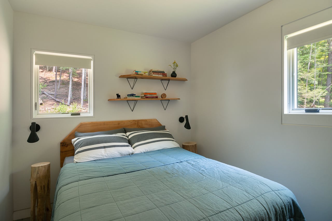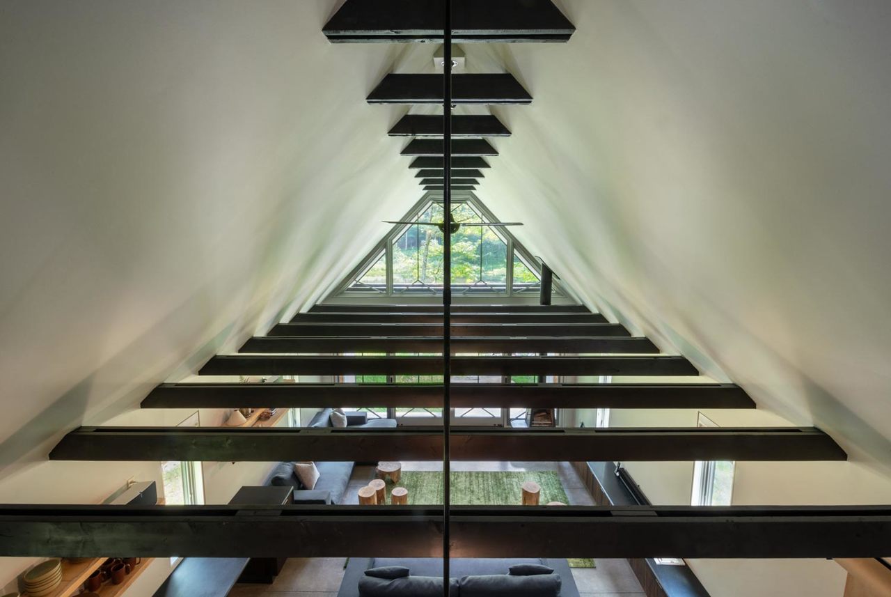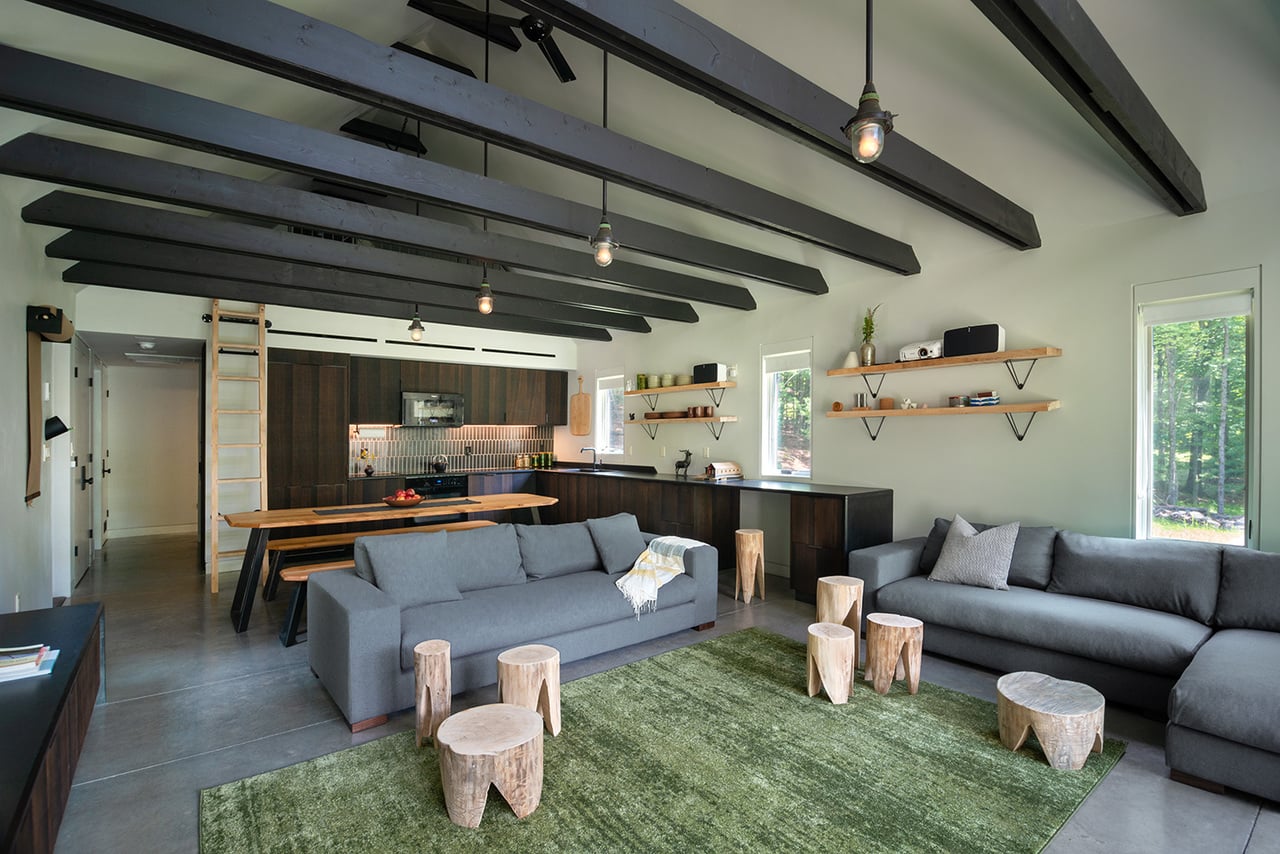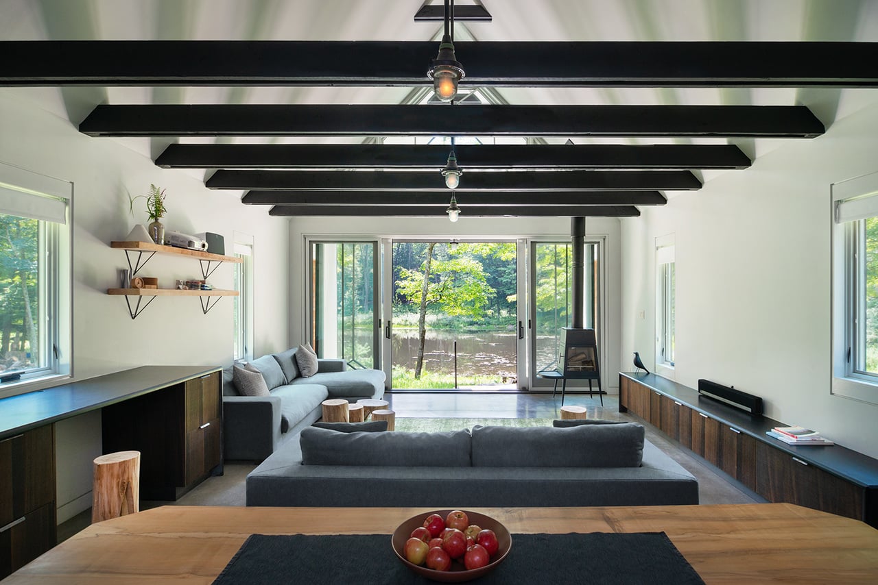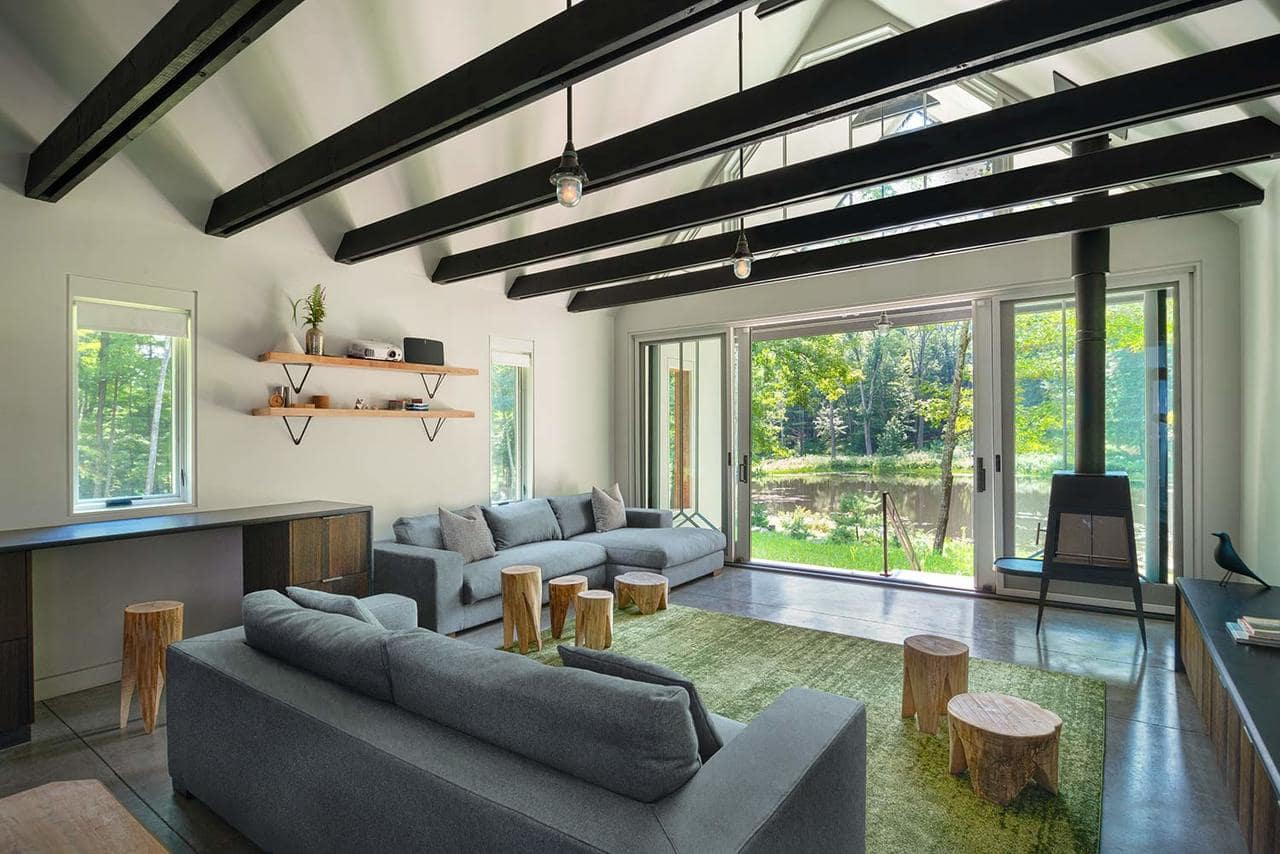 The design avoids convolution and disarray, but in away that employs touches of monolithic sentiment. You’ll find that there’s not much detail at first glance. But on the second and third glances, there’s so much to see. That stilted fireplace. And that exposed beam ceiling whose trunks hide an atrium on the far end. Those wooden stools. Each of those makes this slice of rural New York a joy to live in.