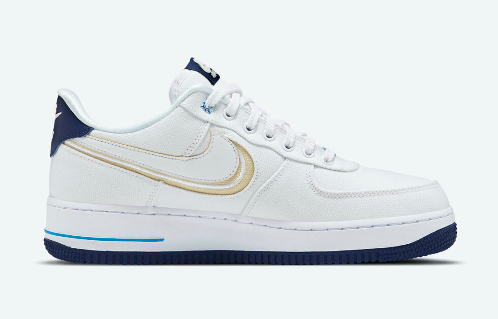 The Air Force 1 Premium White/Fossil Blue touts a white canvas upper. The Swoosh logos on both sides are leather and are superimposed over a cream canvas panel within the cutout. You have metallic blue on the dubrae and top lace hole trim. The superimposed motif also shows on the tongue branding, heel tab, and sockliner.
