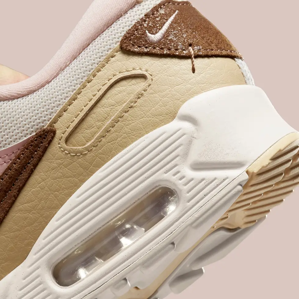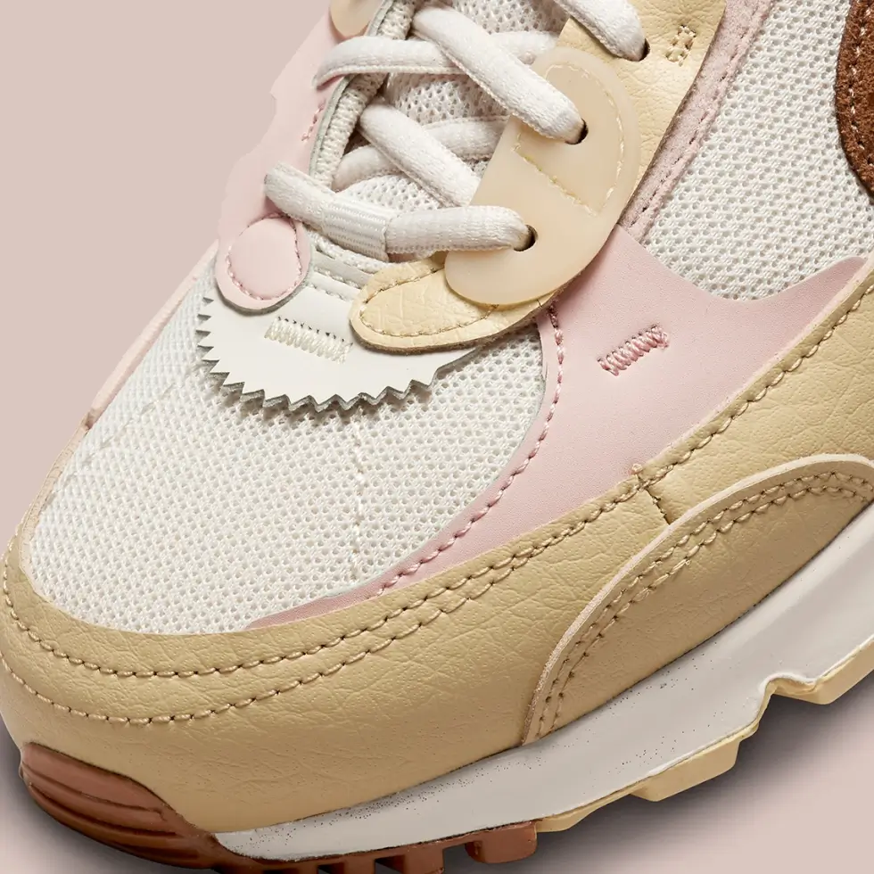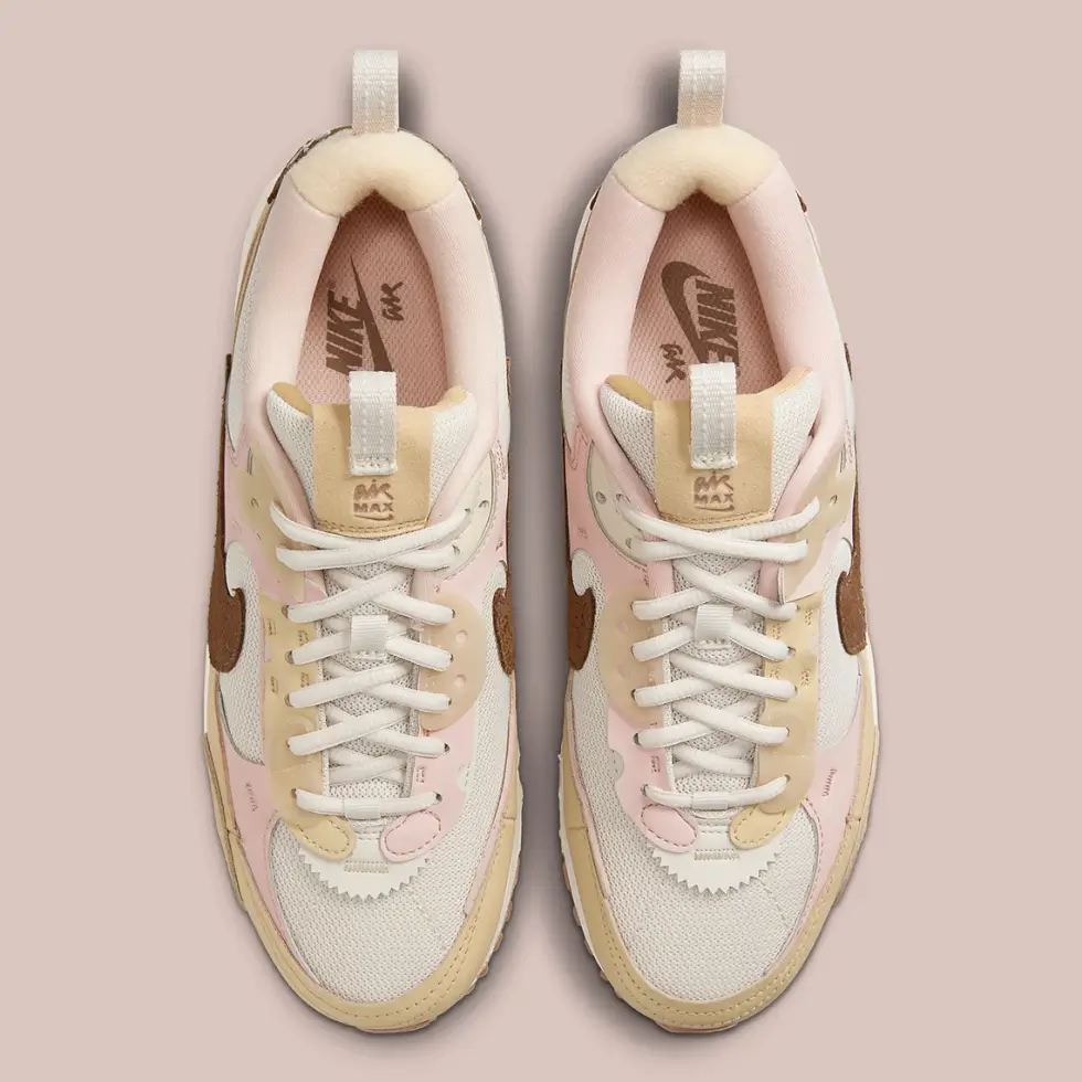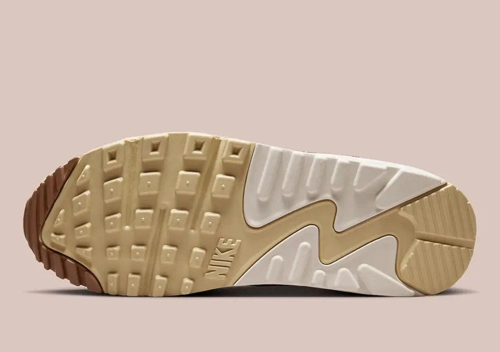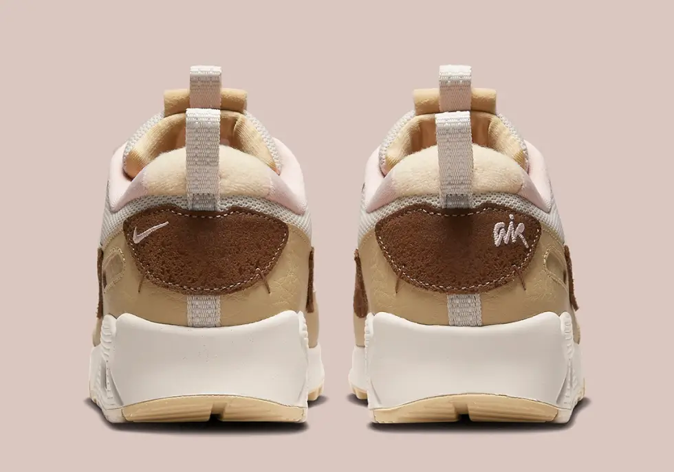 There’s also a dollop of it on the lace cages, tongue tags, inner lining of the tongues, and collar padding on the heel. Nike opts for a darker brown tone on the Air Max 90 Futura heel tab and the Swoosh logos on each side. Furthermore, these feature a texture we usually see on actual ice cream.
