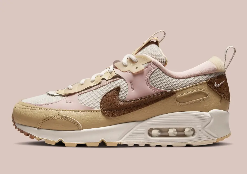 Neapolitan won’t be complete without strawberry and this Air Max 90 Futura has more than enough on it. Shades of pink are visible on the leather panels, lace cages, collar, inner lining, and sockliner. Finally, we have the outsole with patterns in white and two shades of brown.