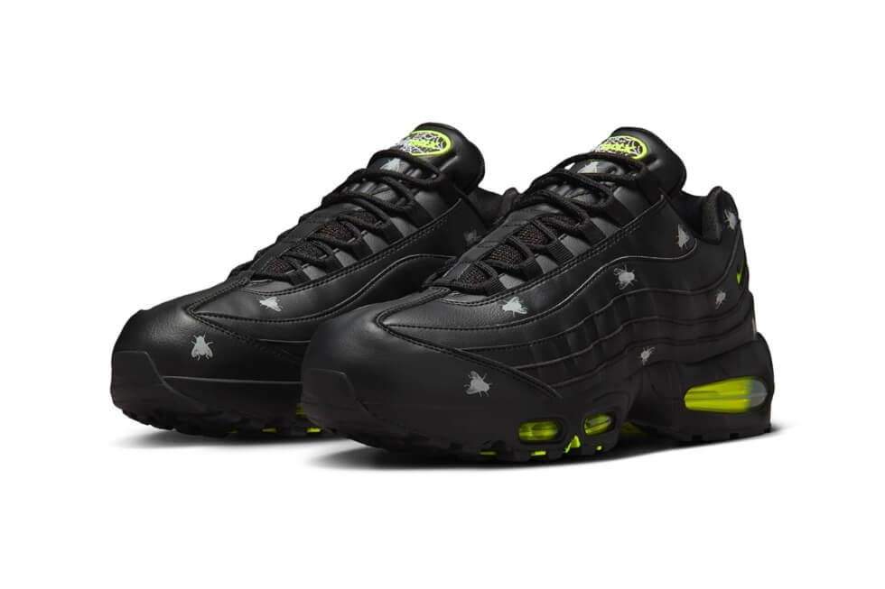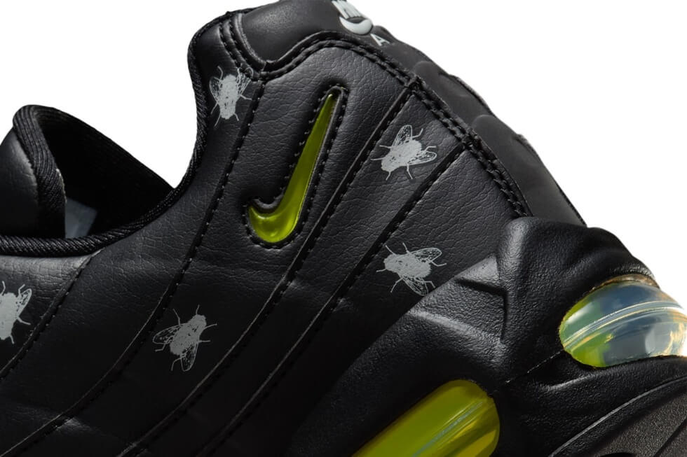 The upper construction uses leather with additional textural highlights from the stitching. Apart from the insects, chromatic contrast comes from the Neon Yellow Swoosh logos near the heel, Air units, tongue tag, sockliner, and outsole. Nike says the Air Max 95 “Houseflies” will be available for purchase on October 21, 2025.