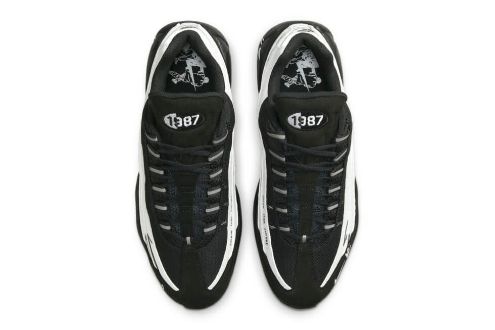A mesh/suede tongue shows an embroidered “1987” branding while reflective loop eyestays line sides and keep the shoelaces in check. The heel adds another contrast with the silver-toned elements and a black Nike Air branding on the tab. Take out the sockliner of the Air Max 95 “Sketch With The Past” to see a special illustration.