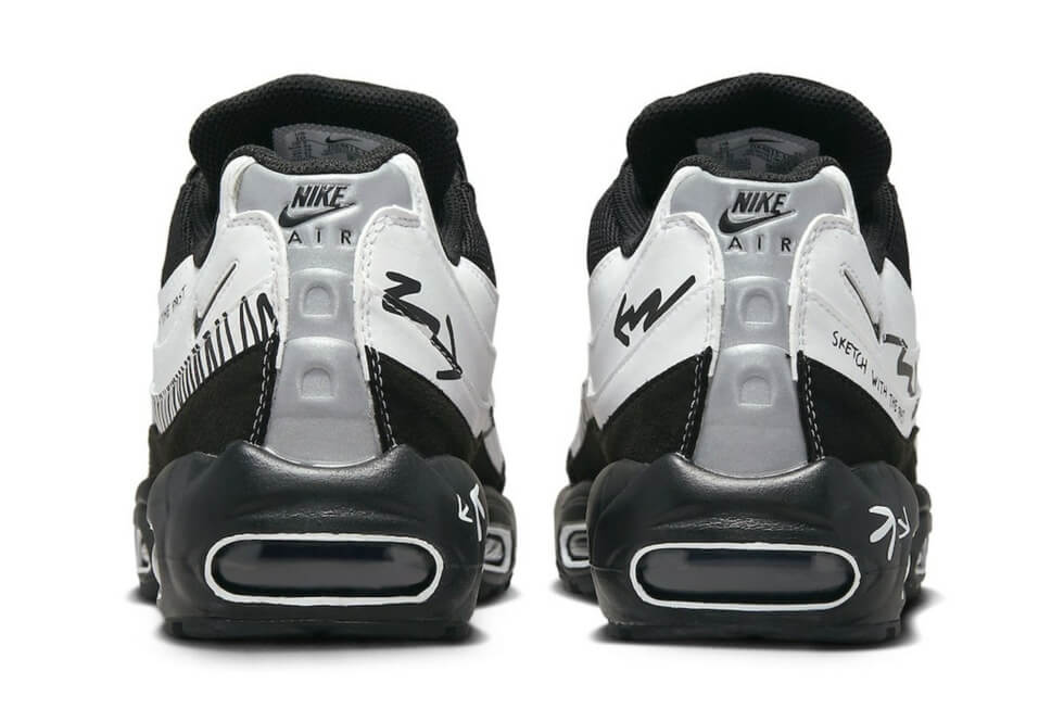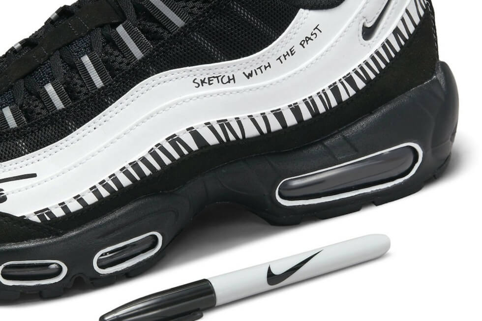 As for the marker bundled with the Air Max 95 “Sketch With The Past” shoes, Nike wants you to use them. Obviously, the only sections you want to draw on are the white leather of the upper. The words “Draw our Future” and “Sketch With The Past” adorn the sneakers along with stylized markings.