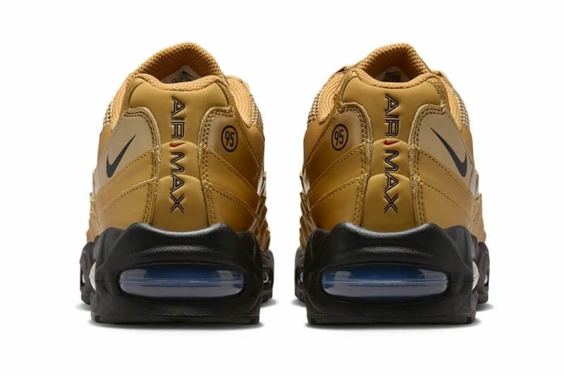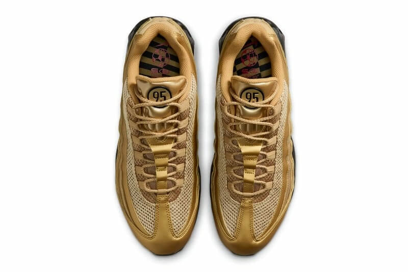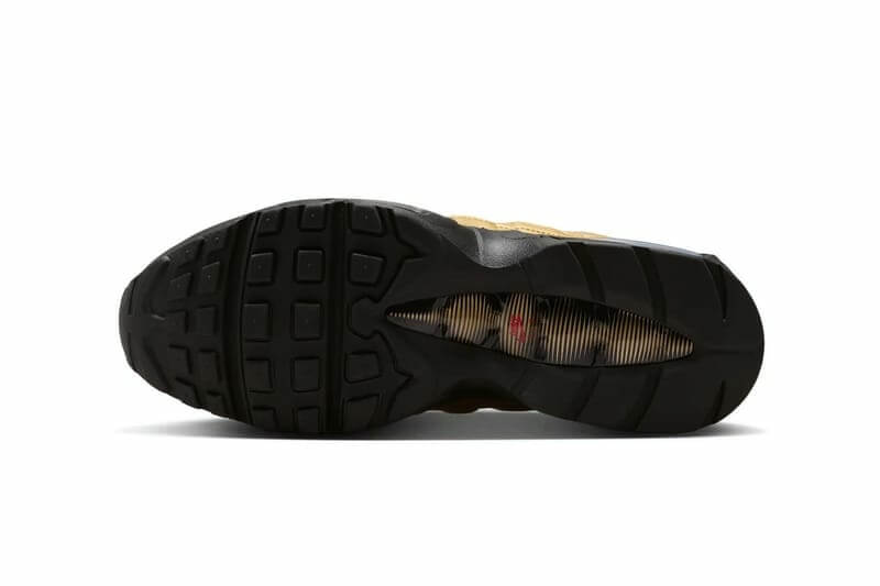 As much as we would have preferred the midsole and outsole in the same shade as the rest, Nike knows better. Hence, the Air Max 95 Total 90 Metallic Gold has these rendered in black, alongside the Swoosh emblem at the lateral side of the ankle section. On the opposite surface is the 95 roundel. The heel counter, meanwhile, gets an Air Max branding and a small red Swoosh.