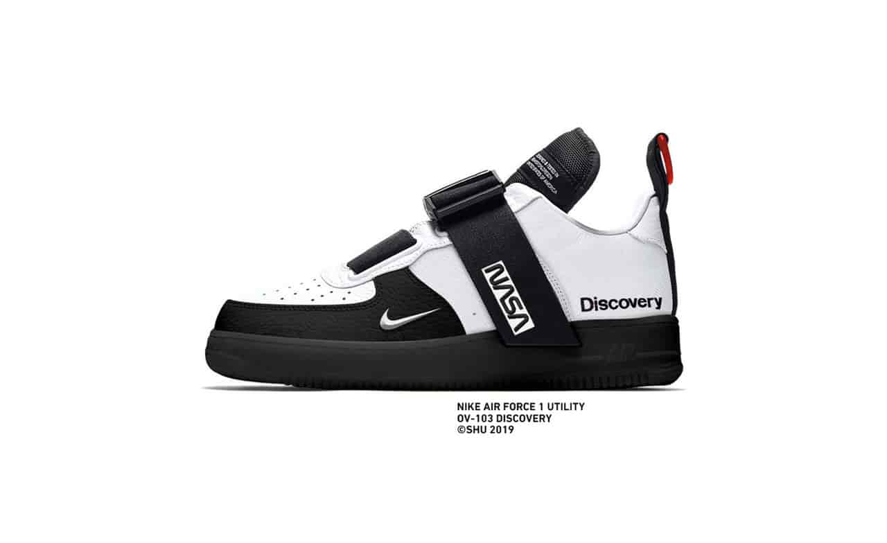 Shulipa took three of Nike’s most iconic silhouettes, which comprise his made-up collection. The aforementioned Air Force 1 Utility references the Discovery (OV-103), an iconic NASA transport spacecraft. It’s got a black and white color scheme, “Discovery” branding, and a small NASA patch on the shoe’s wing.