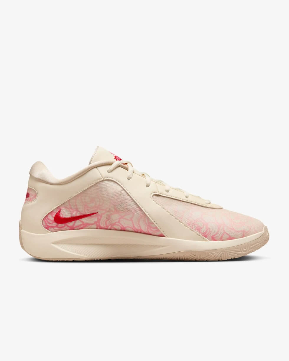 Distinct details on this shoe are on full display on the breathable upper as Nike adorns it with images of roses. These appear as embroidery on the lateral side and as printed patterns behind a translucent fabric that spans the rest of the top. The motif appears once more on the Giannis Freak 6 tongue tag embroidery.