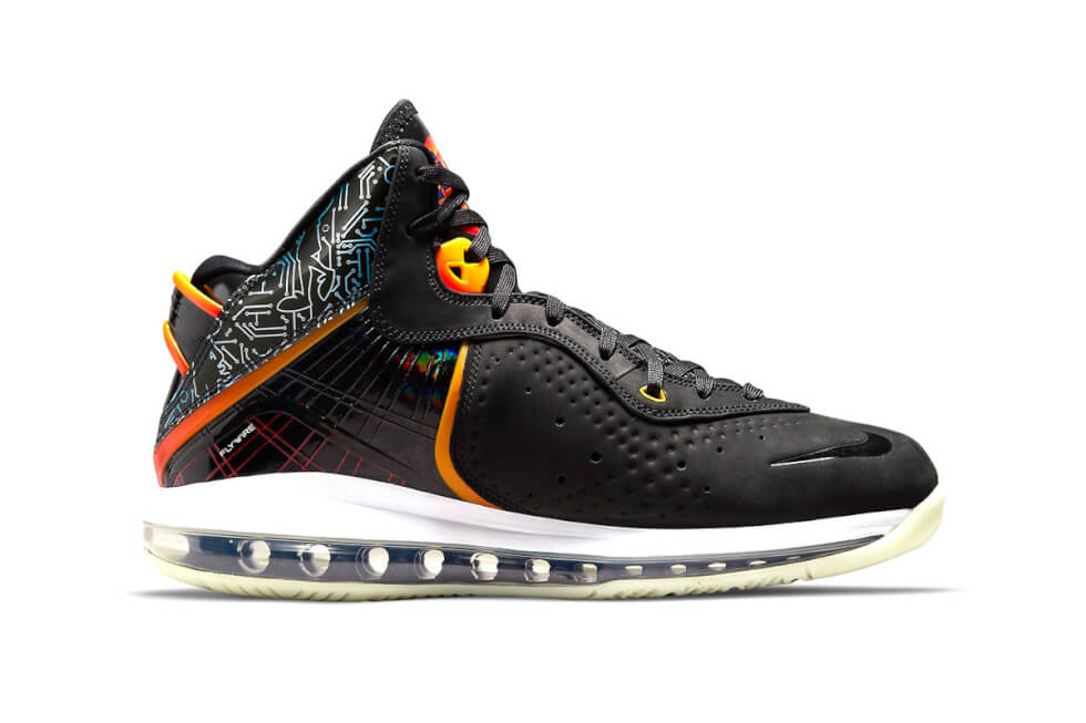 Another set of overlays on the midfoot and heel of the LeBron 8 Space Jam come with a printed graphics of circuitry. If you stare at the patterns closely, there are silhouettes of a basketball and other characters. The Flywire branding is then printed on the medial overlays.