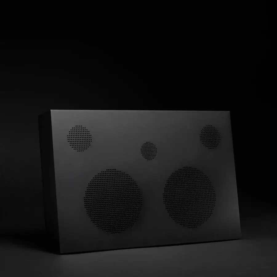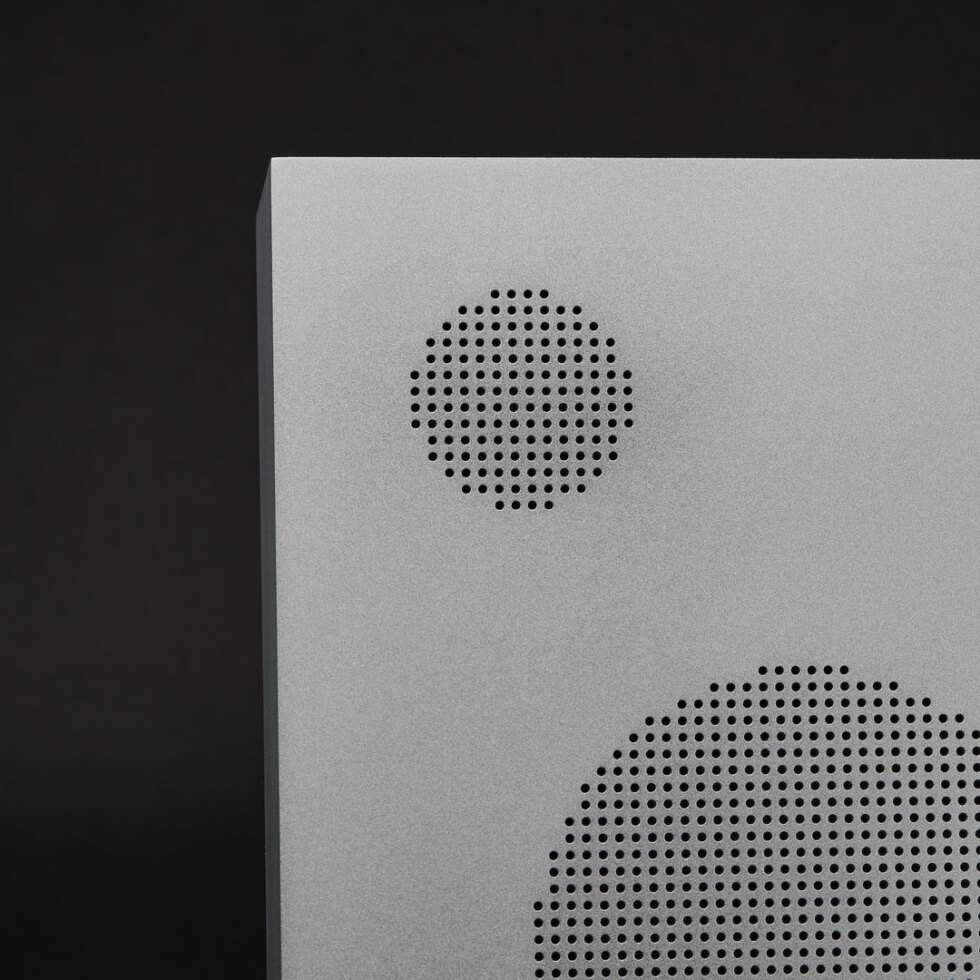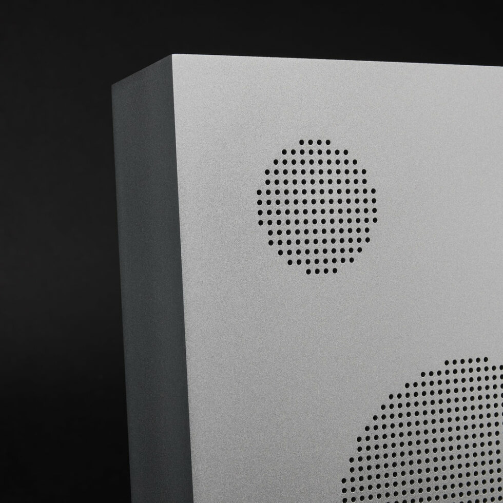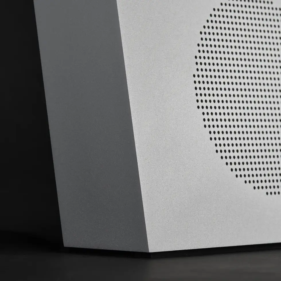 This audio device flaunts a clean aesthetic we often see on Apple products. As its name implies, the housing appears like a geometric slab of metal that can easily pass for a modern art sculpture. However, the machined perforations arranged as round grilles are a dead giveaway for what it’s all about.