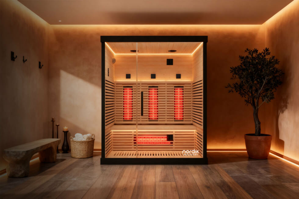 Nordik Recovery’s Infrared Sauna is available in a single, two-person, or three-person capacity. It uses full-spectrum infrared with NordikTherm DualWave Technology (Carbon + Infrared), which blends broad radiant carbon panels with focused infrared emitters that gently warms the body for faster sweat response.