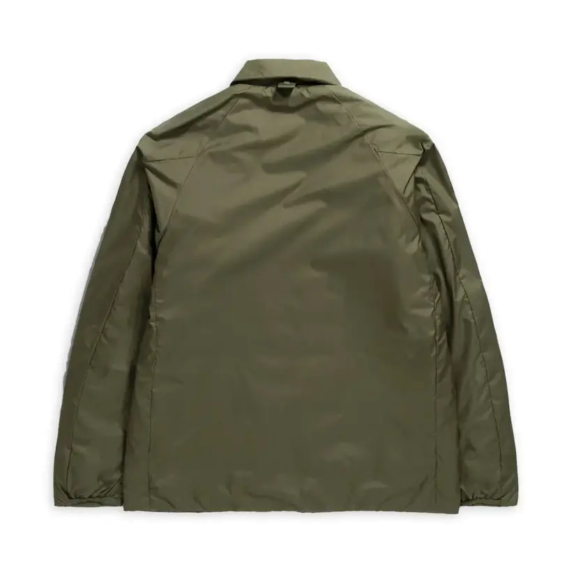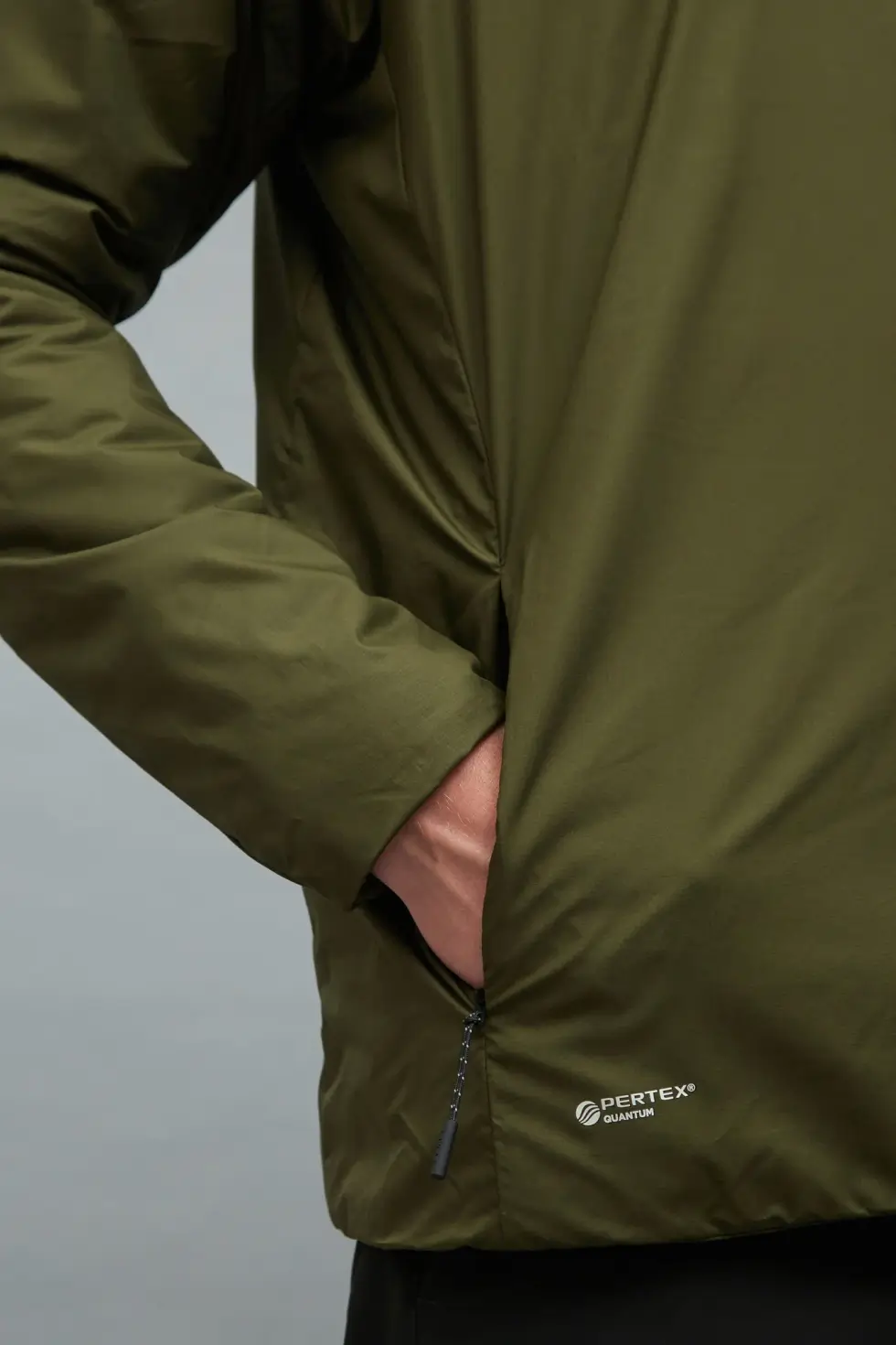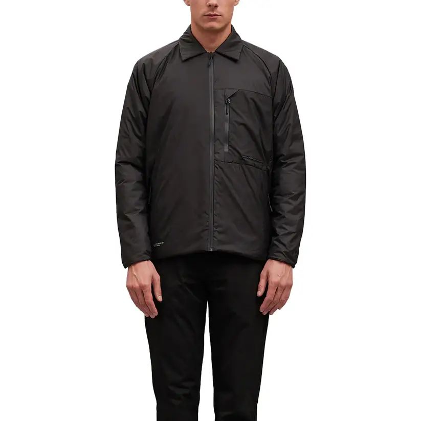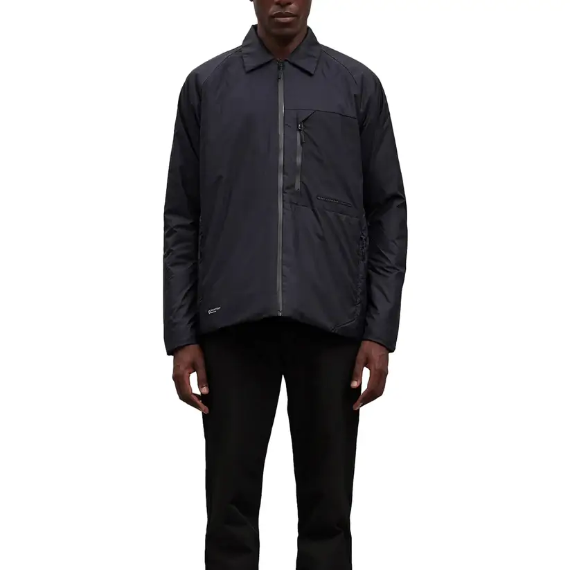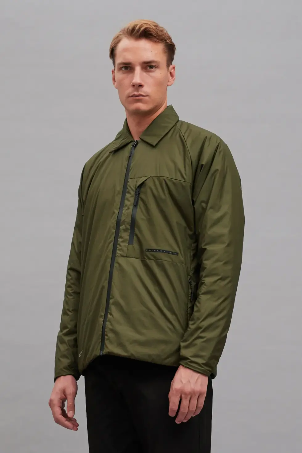 This insulated shirt jacket is made from 50% recycled polyester and 50% polyester with 100% polyester lining. It utilized Pertex Quantum technology, which is a technical fabric that uses a tightly woven structure to offer a light and soft windproof fabric that enables insulation to fully loft.