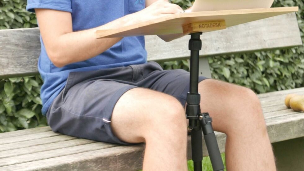 With the NOTADESK, you have your dedicated workspace. It comes in two options: the suction cup/tree clip and the tripod. The tripod makes it convenient to work practically anywhere. You can easily set the legs down on any surface and the desk can securely support your gear. The tripod has two adjustable sizes from 35cm to 160 cm. This makes it easy to use when sitting down too and it can easily turn your desk into a podium.