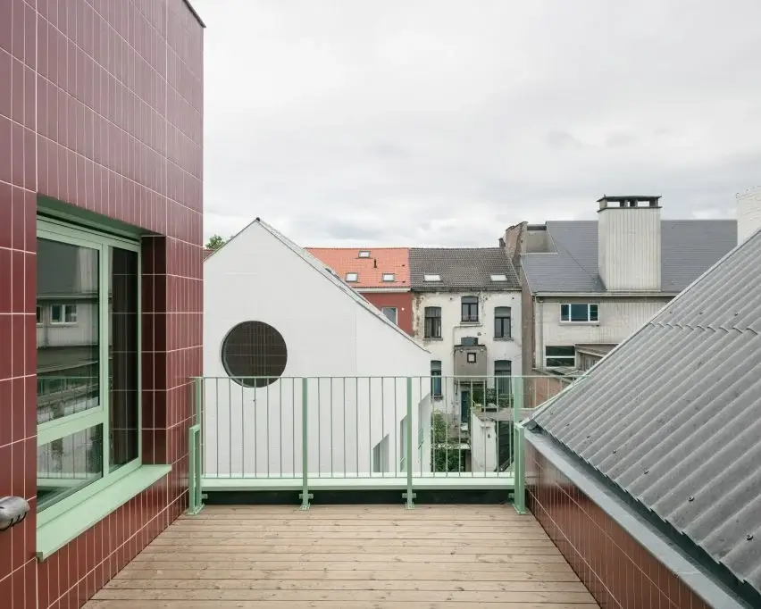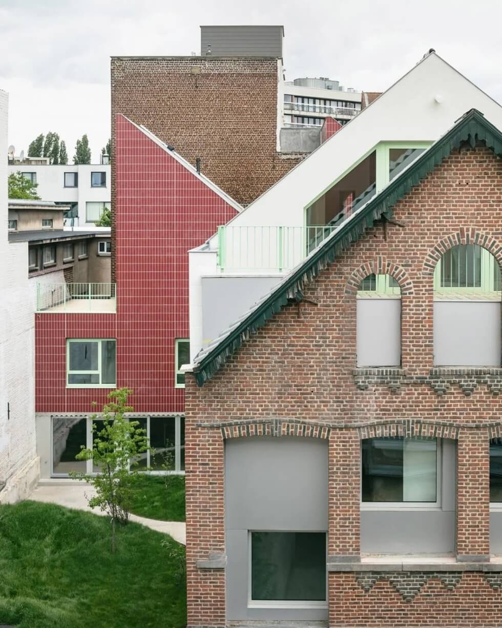 To complete Duchesse, Notan Office preserved the exterior of one of the halls while revamped the others with new tiled volumes. The studio renovated the townhouse and added two new volumes: one behind the hall’s brick facade and the other to the rear of the site. The first volume has crystalline white tiles cladding with its form paying homage to the industrial hall it replaced. The second is clad in red tiles and feature angled sawtooth roofs.