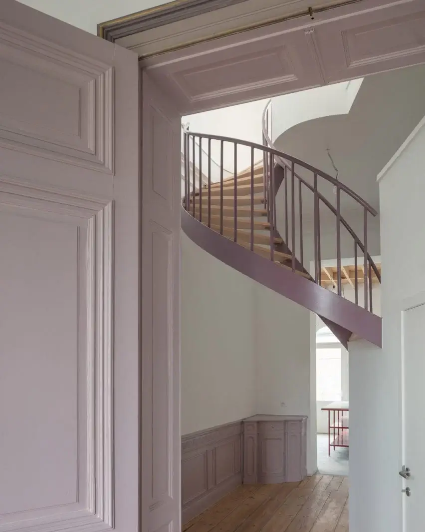 The house in white contain apartments while the volumes in crimson cladding is split into two houses. Meanwhile, interiors are minimalist with cement floors, walls in raw concrete block, and the ceiling in concrete slab. Existing materials both internally and externally were also refurbished including doors, windows, and moldings in the apartments and a winding outdoor staircase. The studio also added a terrace to the new roof.