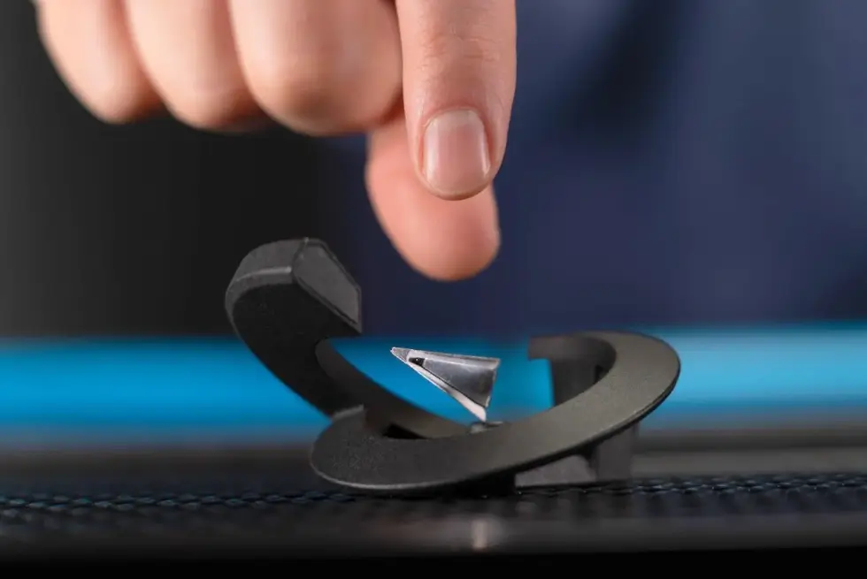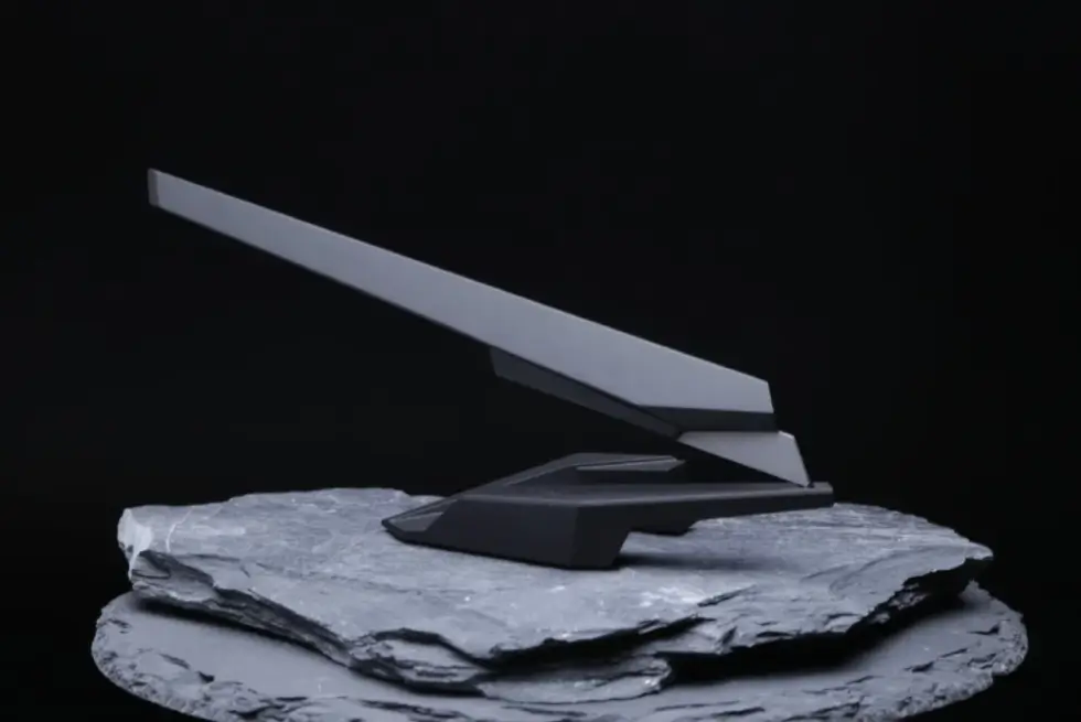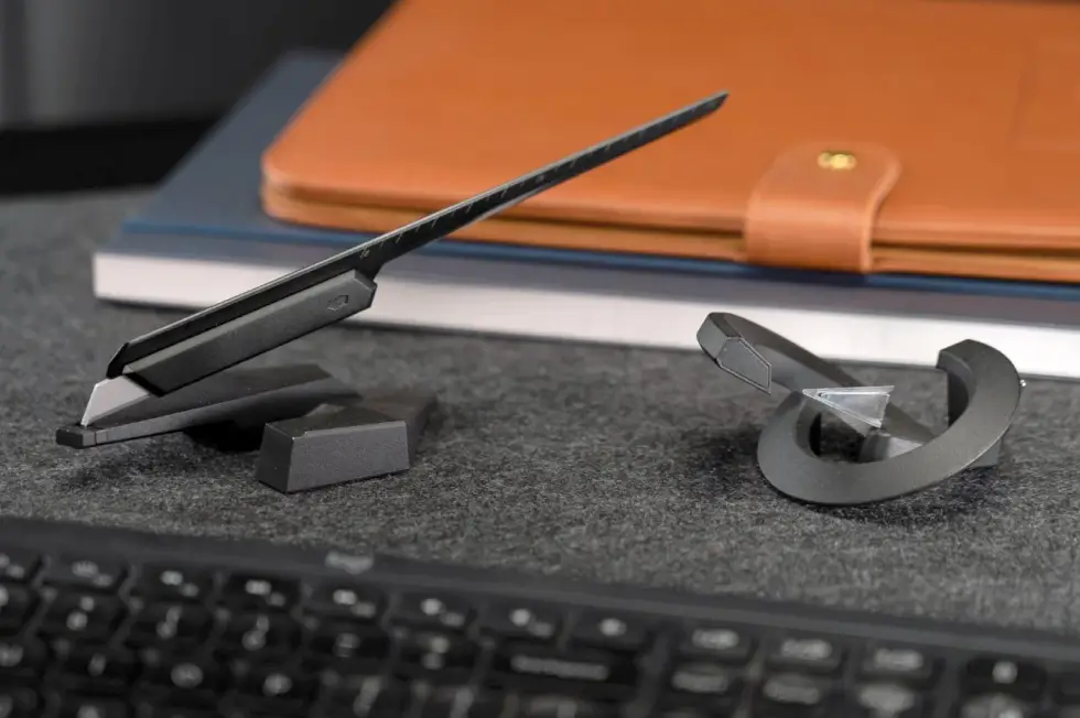The Edge sits at a 12° angle and hovers above its magnetic base through the tip of the blade. It sets into position with a satisfying click. The handle hovers up in mid-air so you can easily grab onto it. This one can easily pass off as a desk attraction or console table ornament. It weighs 25 grams while the base, which is made from zinc weighs 130 grams, making it a great paperweight too. The Edge comes in Space Black and Starlight Silver color options.