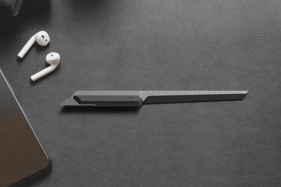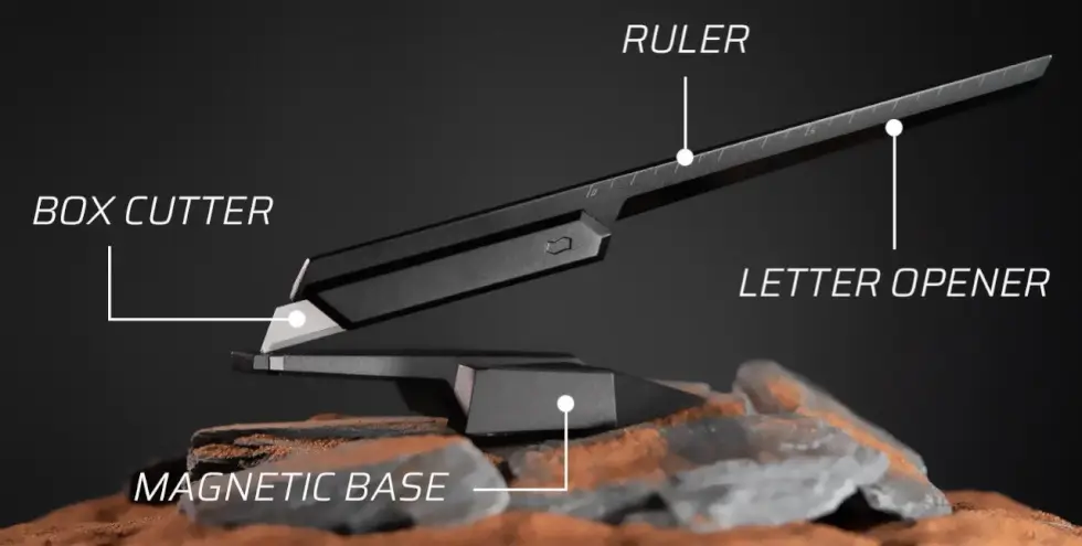 Let’s start with Novium’s Edge. This is a multipurpose tool that serves as a box cutter, letter opener, and ruler. The box cutter is made from stainless steel with a 1mm wide safety tip so it doesn’t hurt your skin just rip through packages. Its anodized aluminum grip has a notched upper surface that serves as a precision scale while underneath it is a semi-sharp surface that can cut open envelopes.