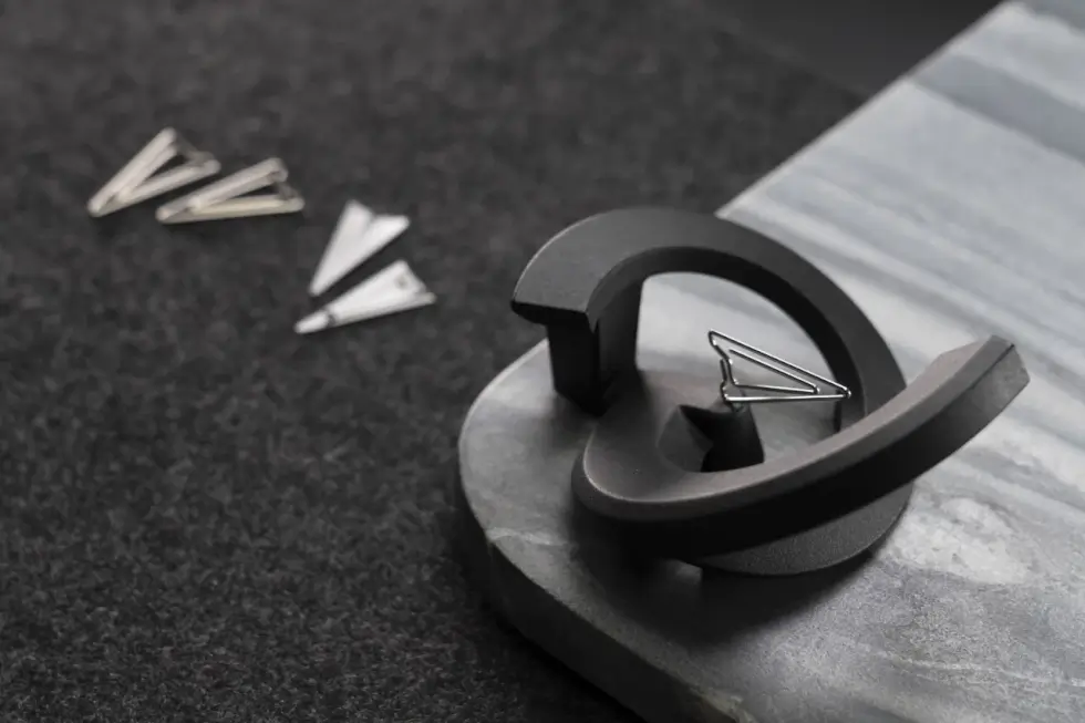 The anti-gravity platform has a docking base for one levitating paper clip and dedicated storage for the other clips on the side. The hovering clip sits at a precarious angle pointing toward the sky. The Shuttleport only comes in Space Black color, making the hovering silver clip in its center stand out.
