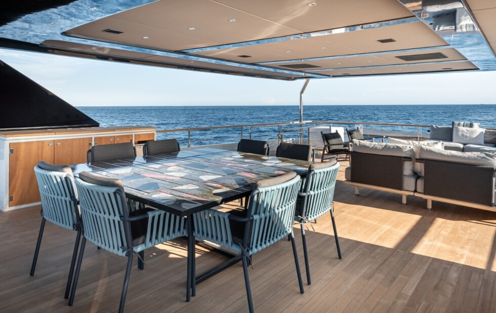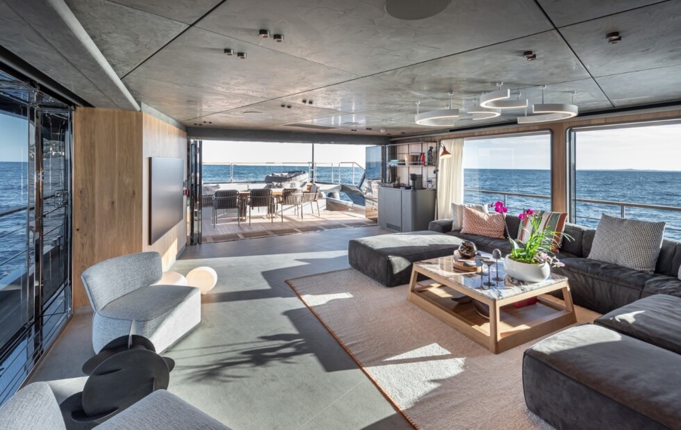The default layout shows a covered flybridge with lounge seats, a dining table that can seat up to eight, and sunbeds in front of the helm. Glazing wraps the interior spaces of the main deck where you can find the saloon, galley, a day head, and forward master cabin.