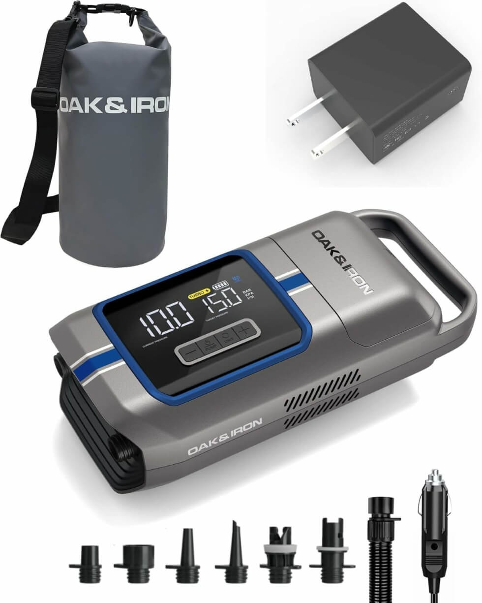 The Oak & Iron Wave Pro Electric Pump is your ultimate solution for inflating gear quickly. It’s labor-saving, portable, rechargeable, and versatile: it works for outdoor and home backyard use.
