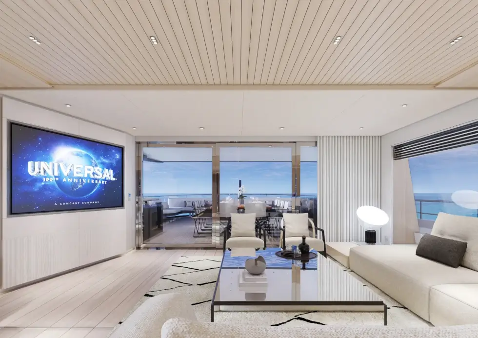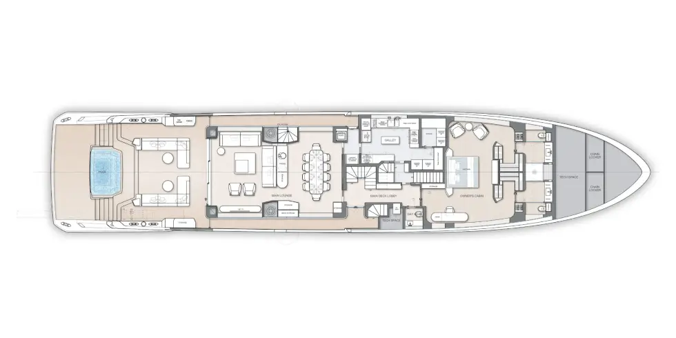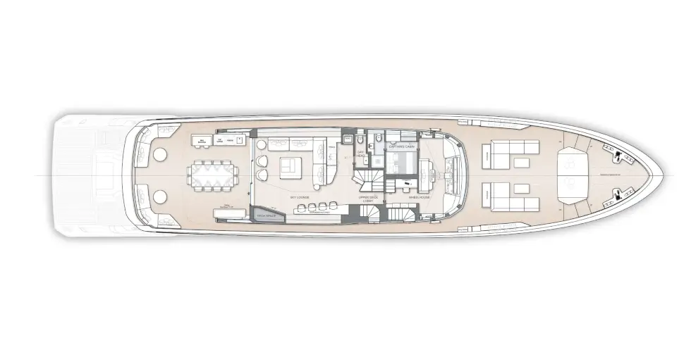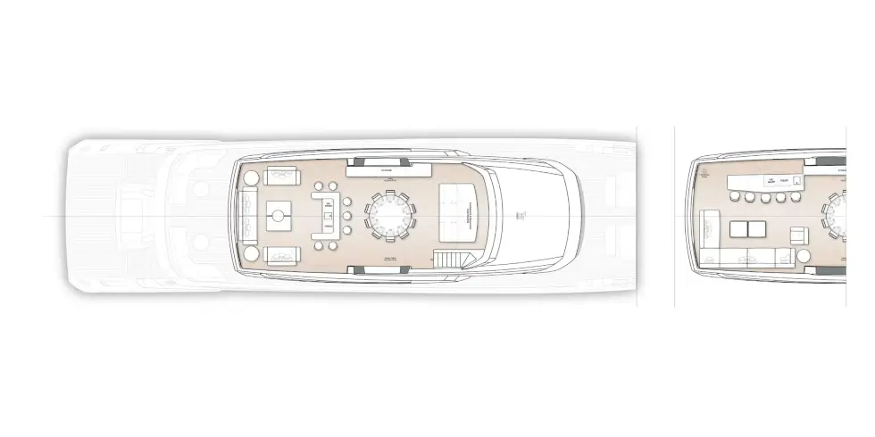 As for the layout, let’s start wtih the sky deck. There are multiple seats for leisure or dining and sunbeds. What follows is the bridge deck, which is arranged to hold the wheelhouse, an aft dining area, a sky lounge, the captain’s cabin, and more sunbeds at the forward section.