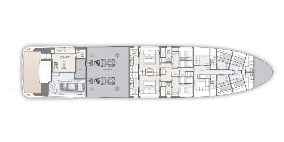 Next is the main deck with the owner’s cabin all the way at the front, galley, main lounge, aft beach club, pool, and swim platform. Lastly, the lower deck houses crew cabins, guest cabins, VIP cabins, a tender garage, a small gym, and engine room. The 40P’s hotel load is powered by twin Kohler 99 kW generators. Elsewhere, propulsion comes from twin MAN V16 at 2,600 horsepower.