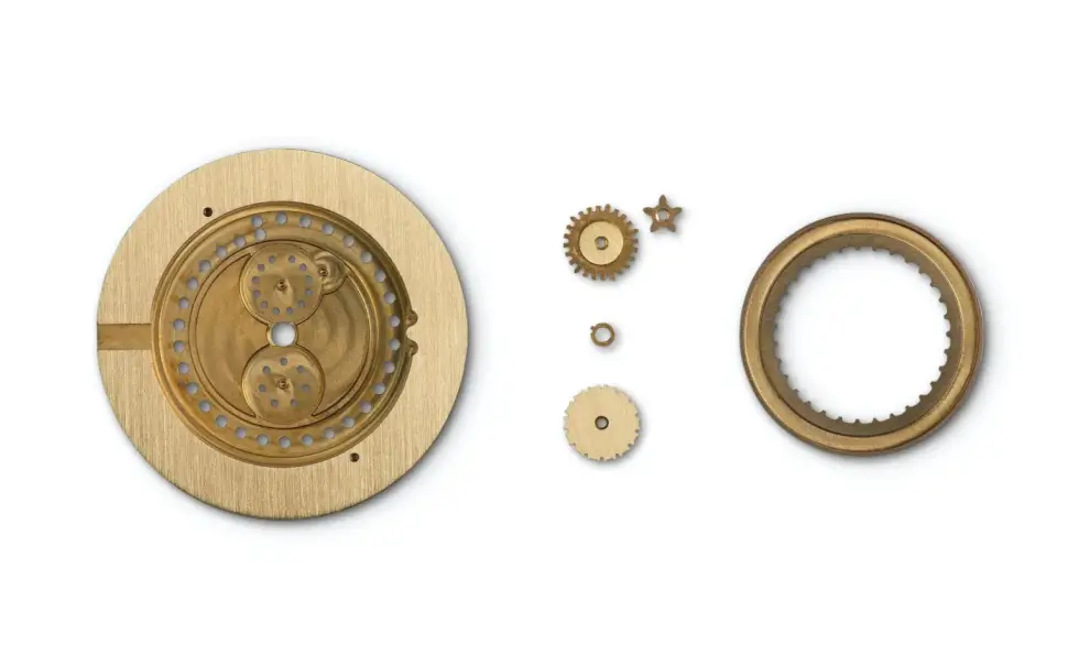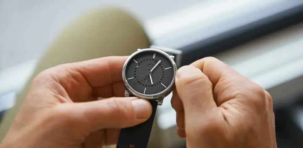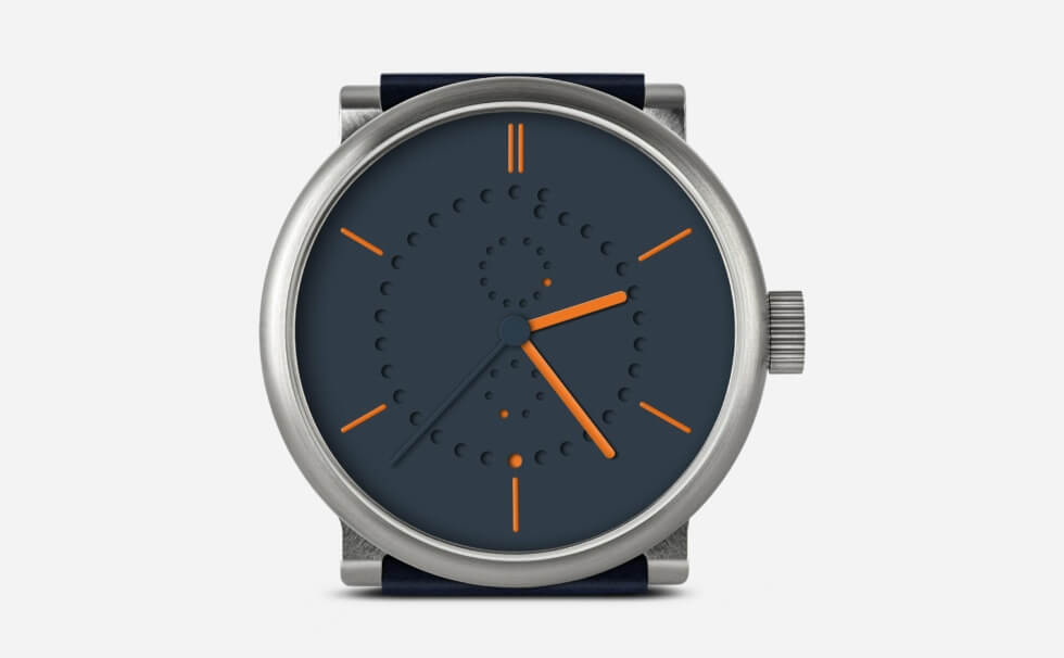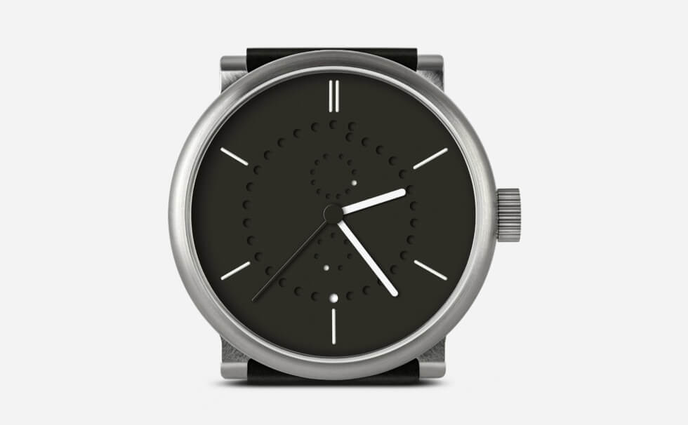 Aside from the stick hour markers, there are perforated dots that stand for specific details. The outer dots represent the date, while the inner ones below 12 o’clock stand for the month. Meanwhile, the rest just above 6 o’clock indicate the weekday.
