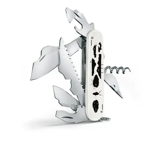 This limited-edition multi-tool follows a design process that revolves around the theme, “Adam and Eve, Androgyny, The Beginning.” As such, it packs tools that you can use both indoors and outdoors and other survival gear. These include a reamer, punch, and sewing awl. Then there’s a wood saw, a large and small blade, a can opener, and a 3mm and 6mm screwdriver. It also has a bottle opener, a key ring, a corkscrew, and a wire stripper.