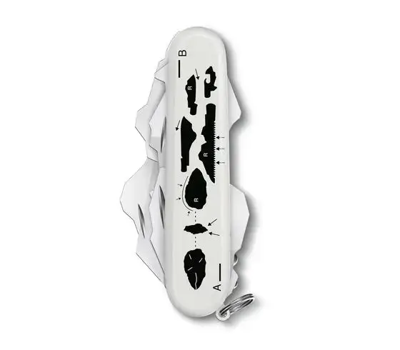 Moreover, the blades represent the stones that have evolved into tools and the protruding rounded edges reflect this. This knife packs seven new shaping tools for a total of six functions. Then there’s one spring to house the directional tools with a unique look. As for its material, it comes in white Corian scales to make it hardwearing and scratch-resistant. Likewise, the white scales make a standout contrast to the graphic black print.