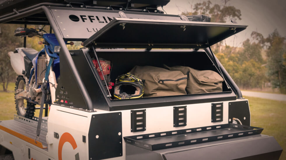 The Ryder even includes an underslung spare wheel holder just in case. The top sports a tread plate tray for your motorcycles and more. Meanwhile, its sturdy tubular frame and roof rack holds a pop-up tent with an integrated solar panel on the top hard shell. A telescoping ladder makes it easy to access as well.