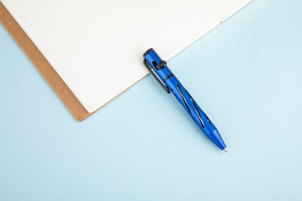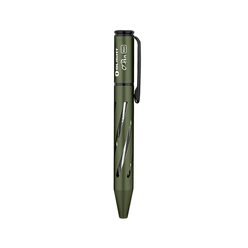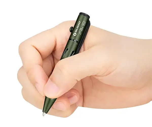 The OLIGHt O’Pen Mini is a short bolt-action ballpoint pen that’s very compact. It can easily slip into your shirt pocket. It’s easy to conceal at just 3.66 inches long but provides just the right amount of grip space in its aluminum alloy body.