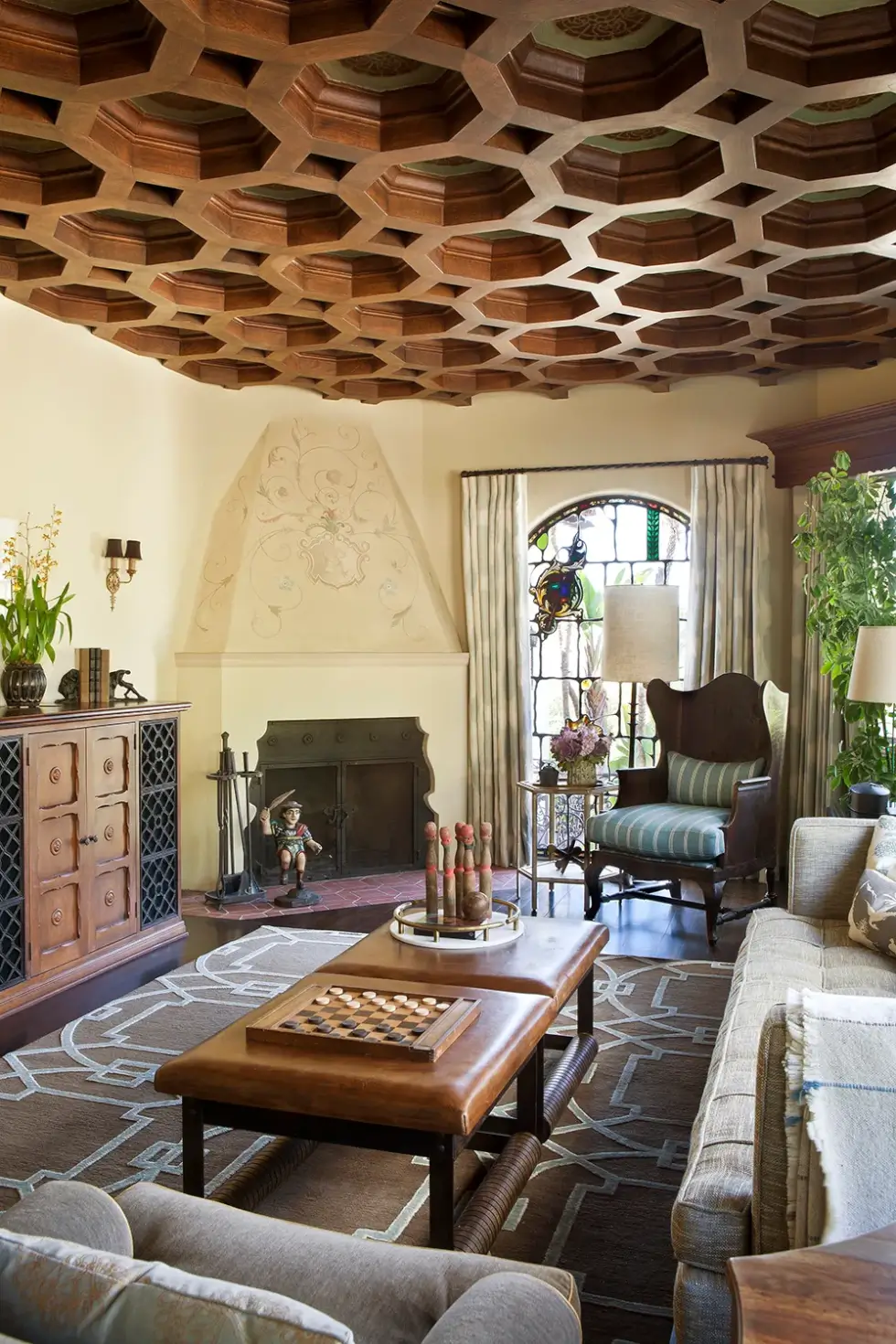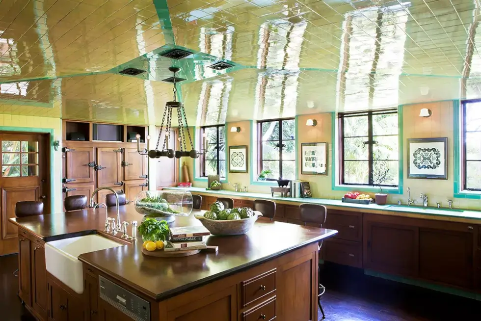 Other highlights include a light-filled library with honeycombed coffered ceiling, stained glass, fireplace, and a Prohibition-style bookcase bar. The dining room rests underneath a hand-stenciled wood ceiling and opens to a covered veranda. The gourmet kitchen is equipped with commercial-grade appliances, a Butler’s pantry, an oversized island, and a breakfast nook.