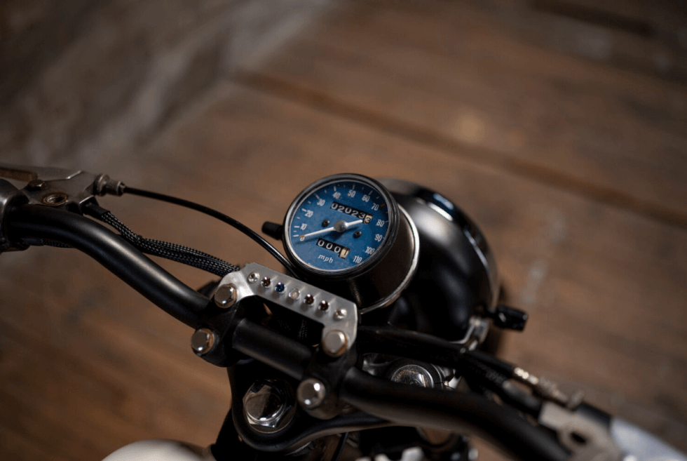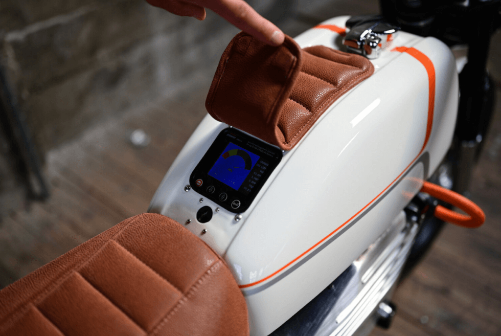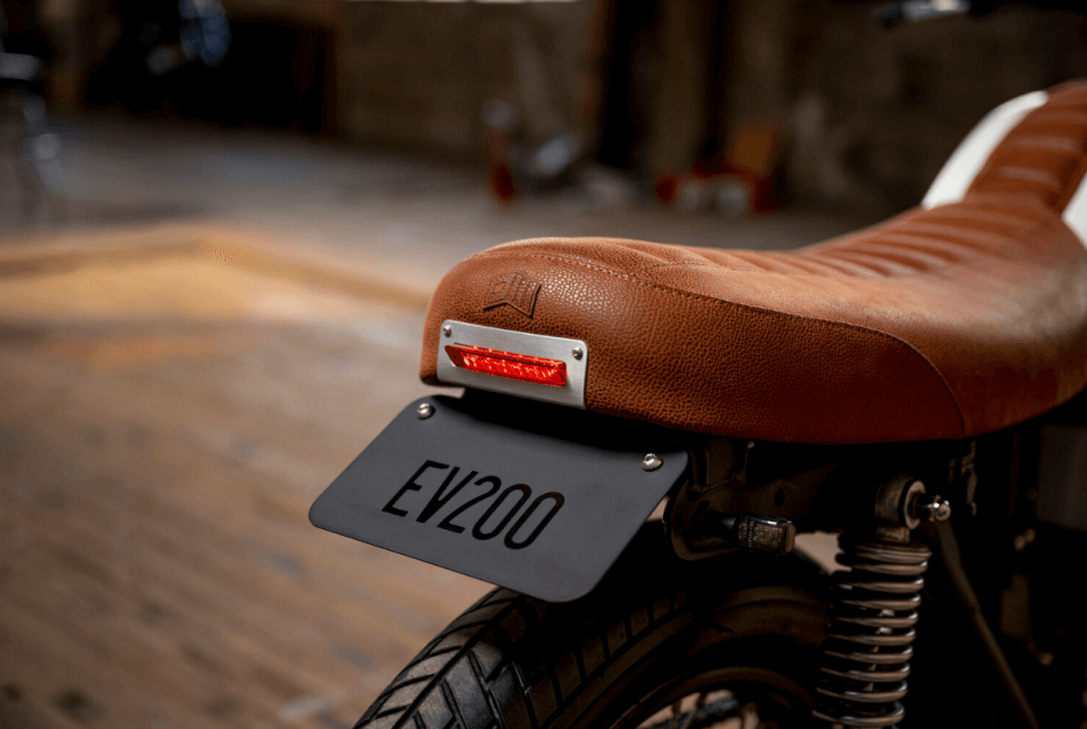 Some of the original parts such as the front forks, brakes, and wheels have been reconditioned as well. Even the original switches and analog speedometer of the CB200 are still in use. To stay on top of your batteries, Omega Motors cleverly hides a status display under the leather flap on the tank. Sadly, the EV200 is a one-off creation only.